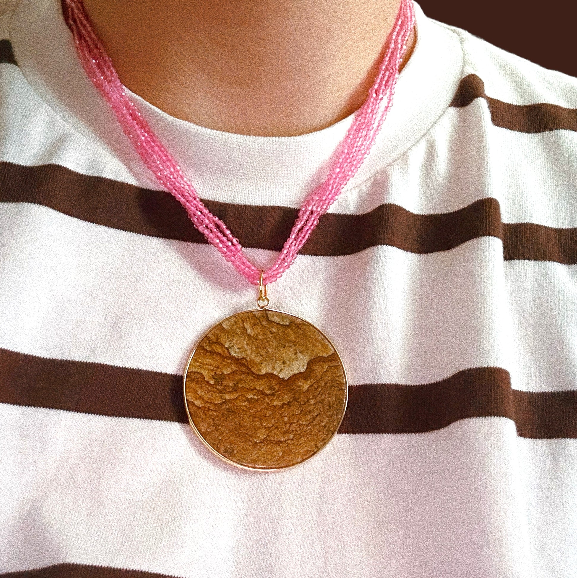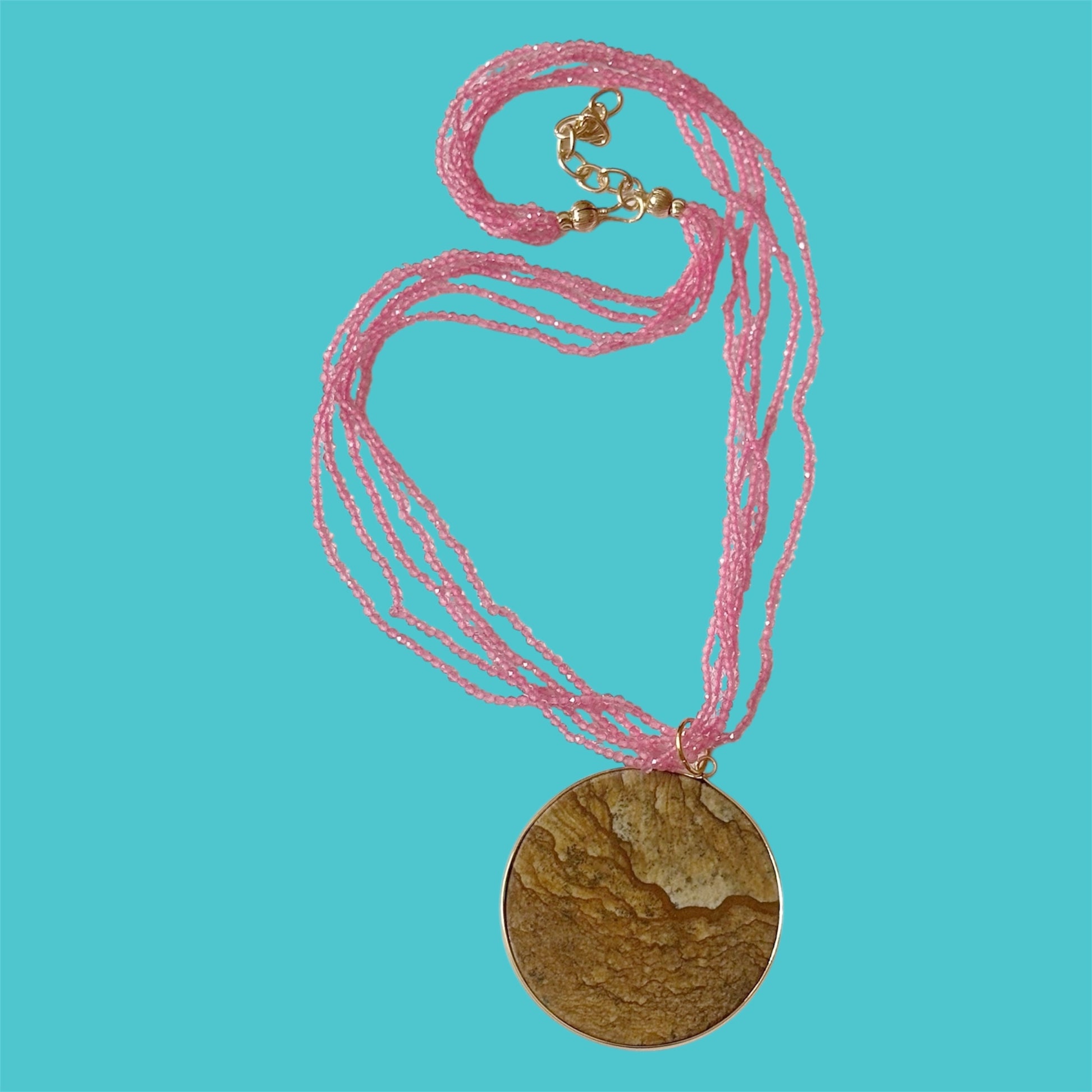 Style 4 - Bubblegum pink beaded chain, Picture Jasper round pendant, gold plated stainless steel hardware.