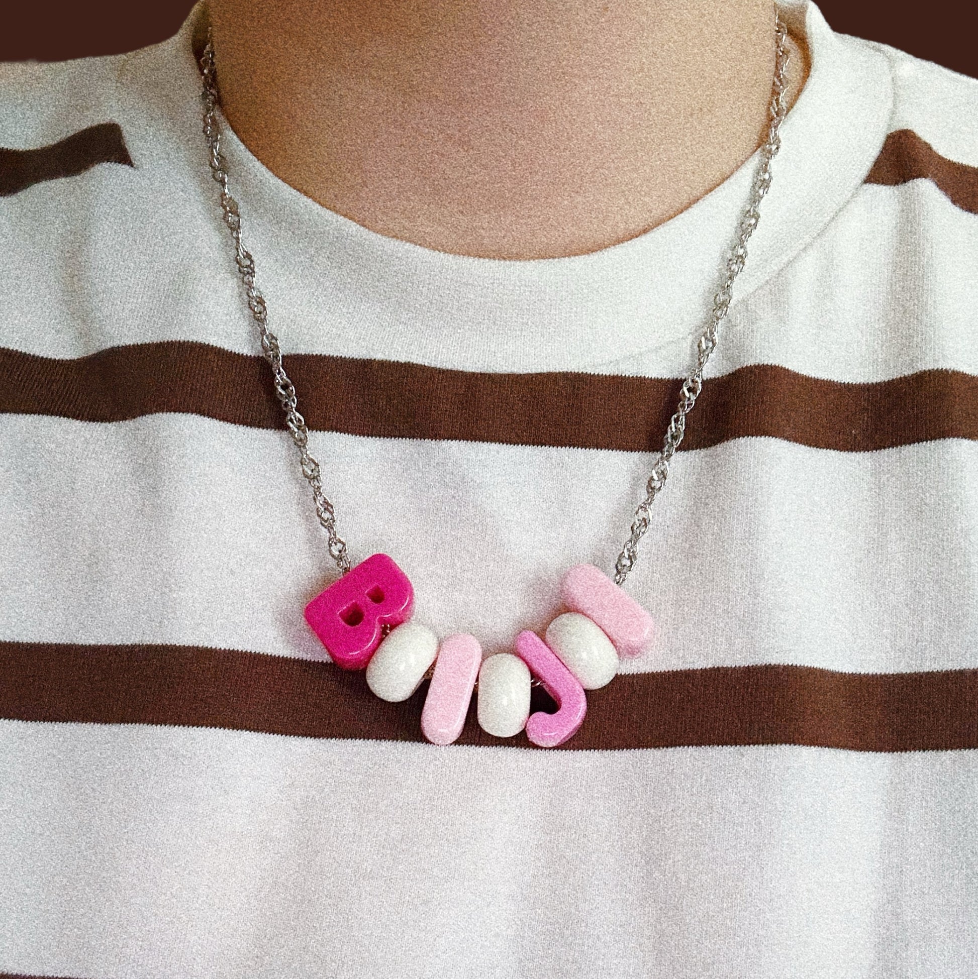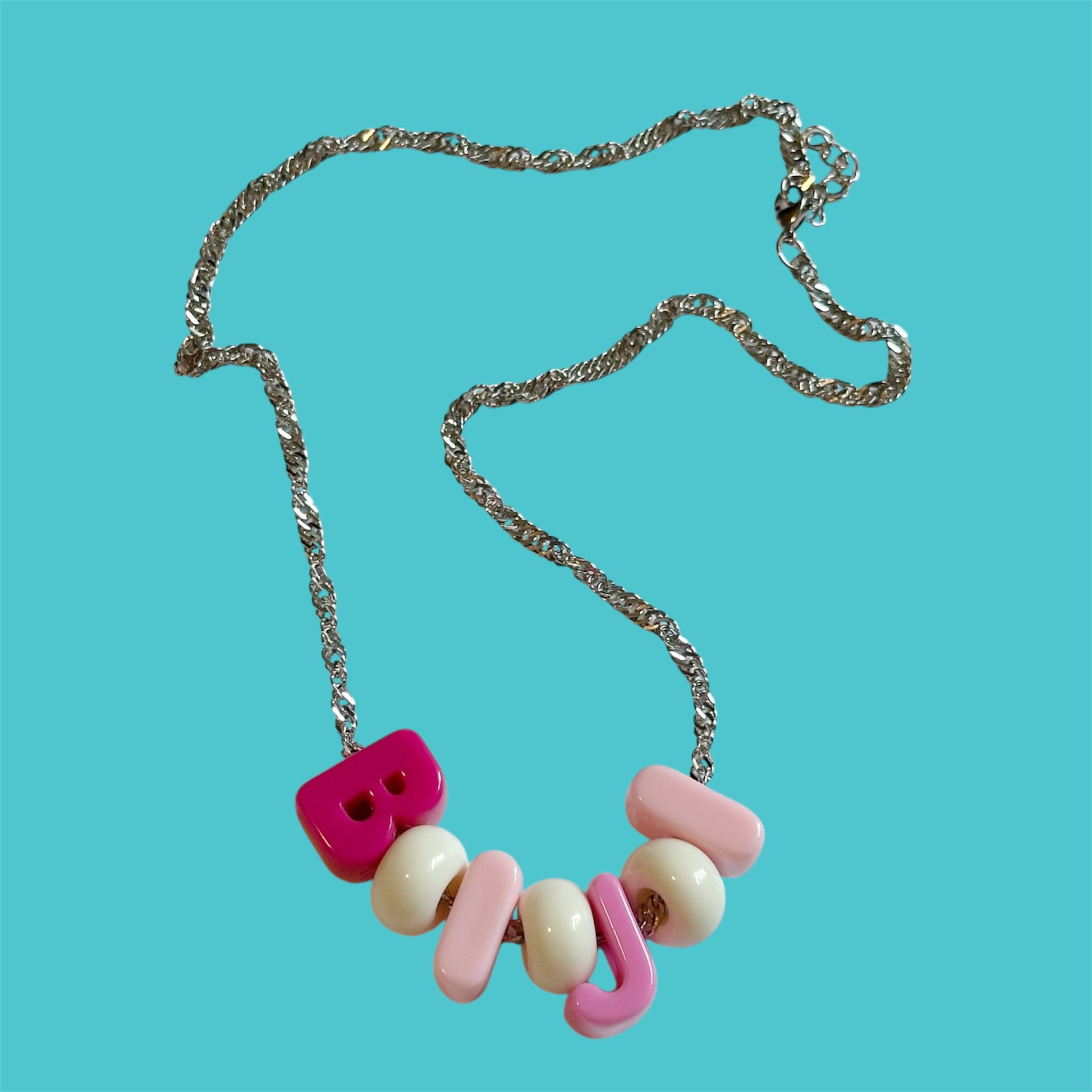 20" stainless steel chain, silver hardware, acrylic block letters and spacers spelling BIJI which means live in Kurdish.