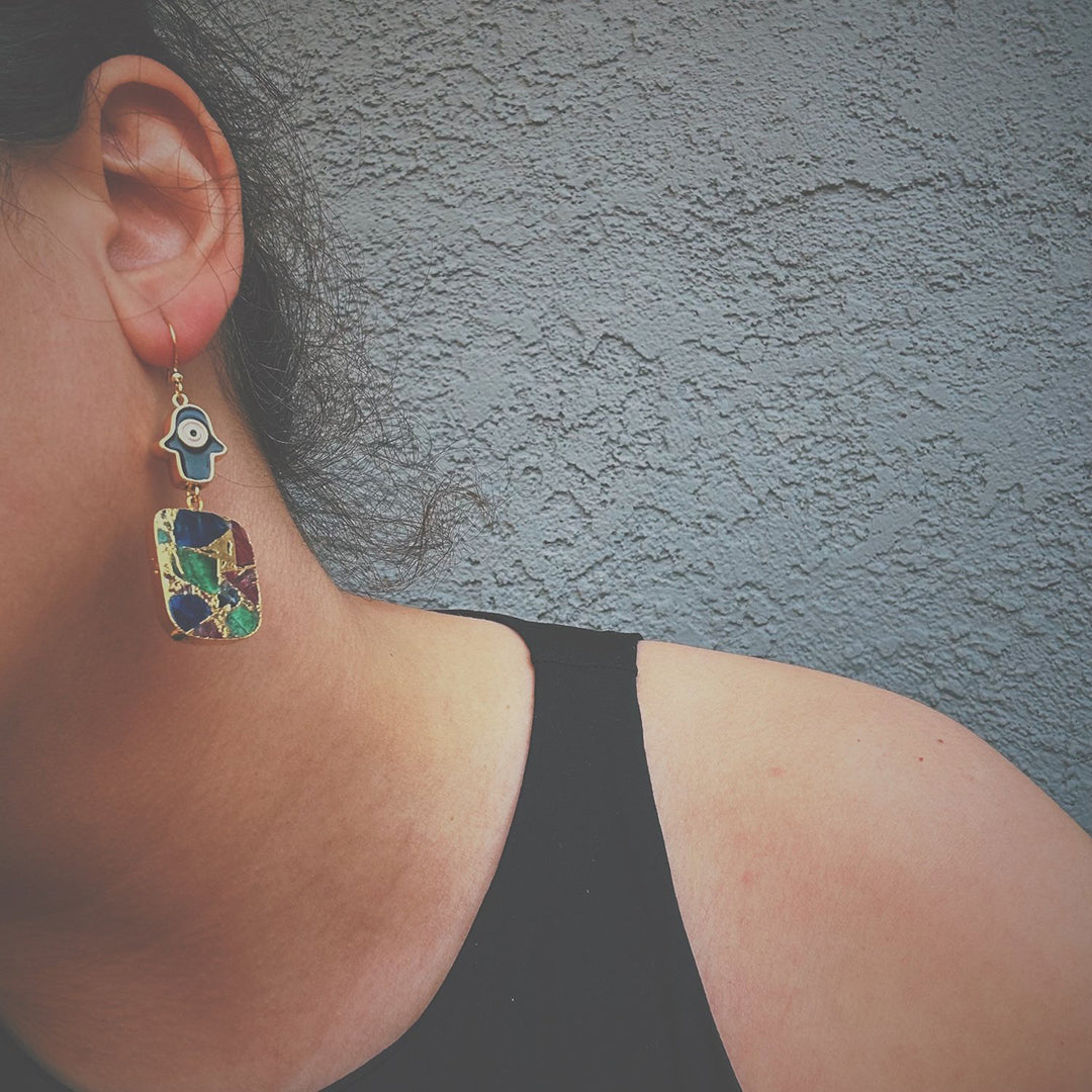 Cooper ruby gold plated pendant and Hamsa charm, each earring going in a different hand direction ——- “If the hand is facing downwards, the owner is open to the universe's goodness and welcoming in good fortune and prosperity. A hand facing up (generally with an eye) wards off the evil eye and protects the wearer from bad luck.” Gold plated stainless steel hardware and findings. Each pair weighs 0.4 ounces.