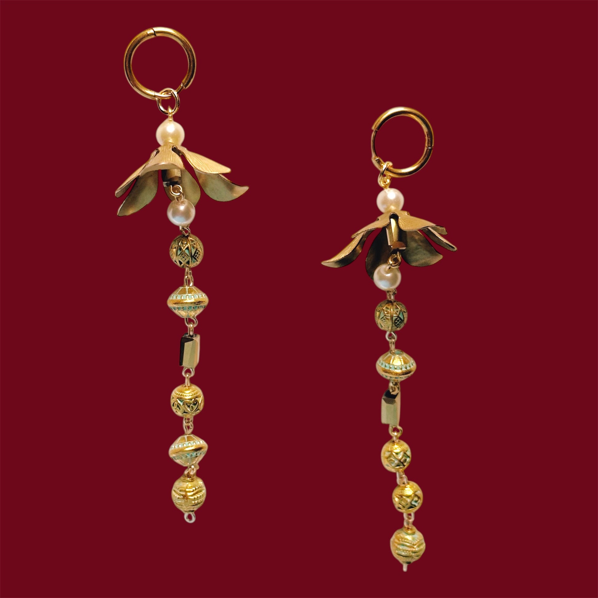 Gold plated stainless steel hardware and hoops, assortment of glass, vintage brass and metal with patina beads and charms.