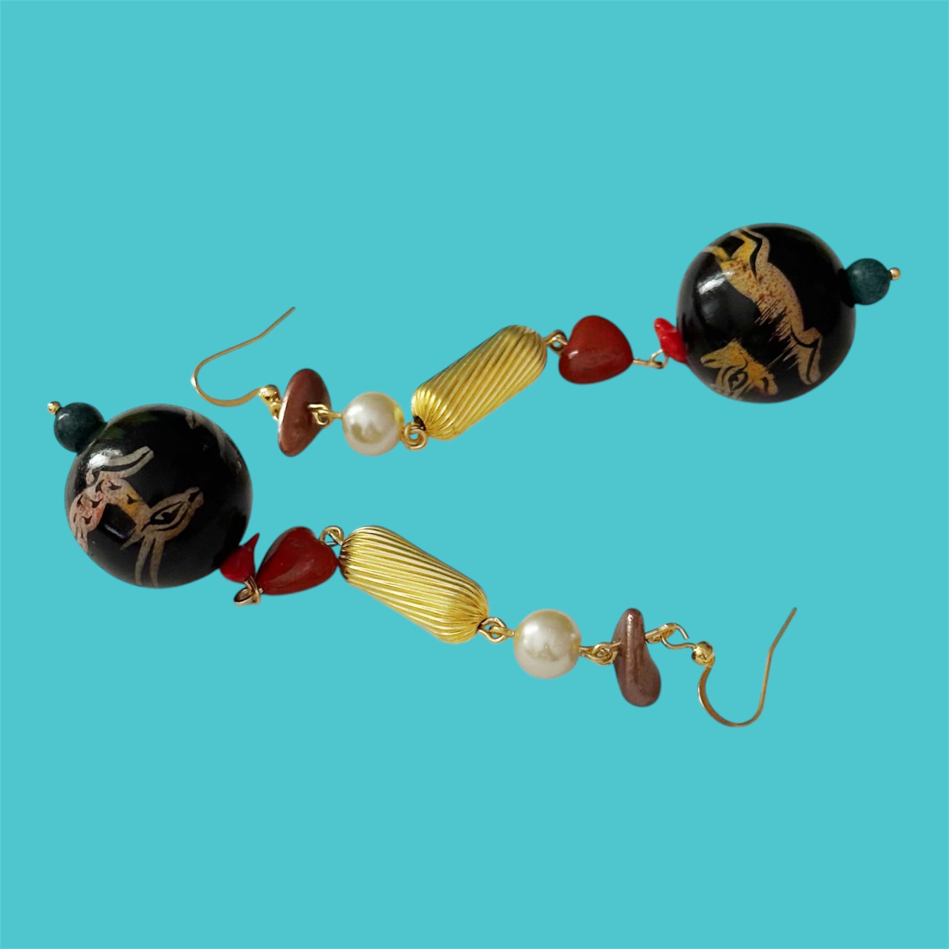 Beaded earrings, pair weighs 0.5oz, gold plated stainless steel hardware and findings, assortment of glass, metal and stone beading, vintage hand painted wooden round beads.