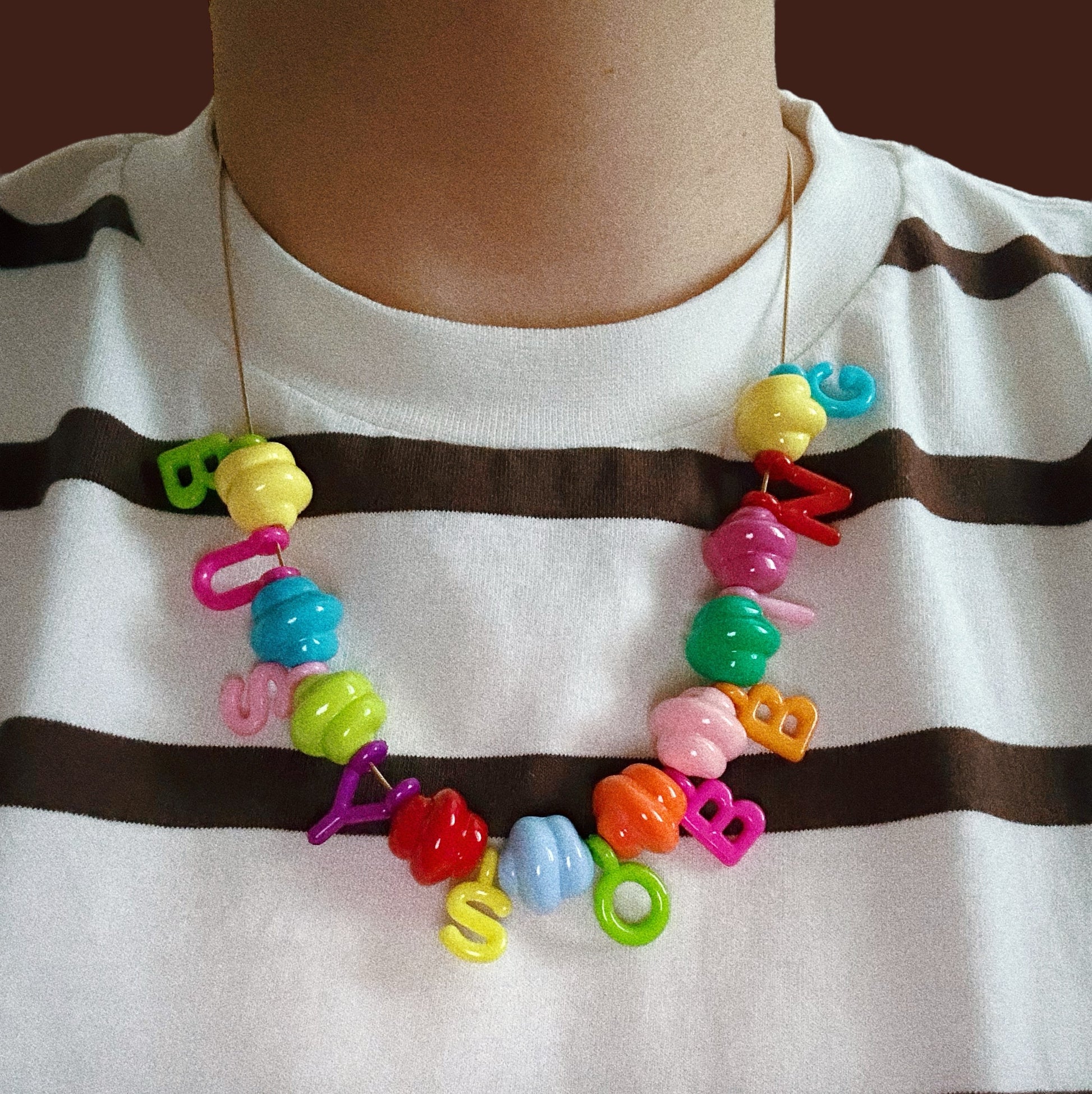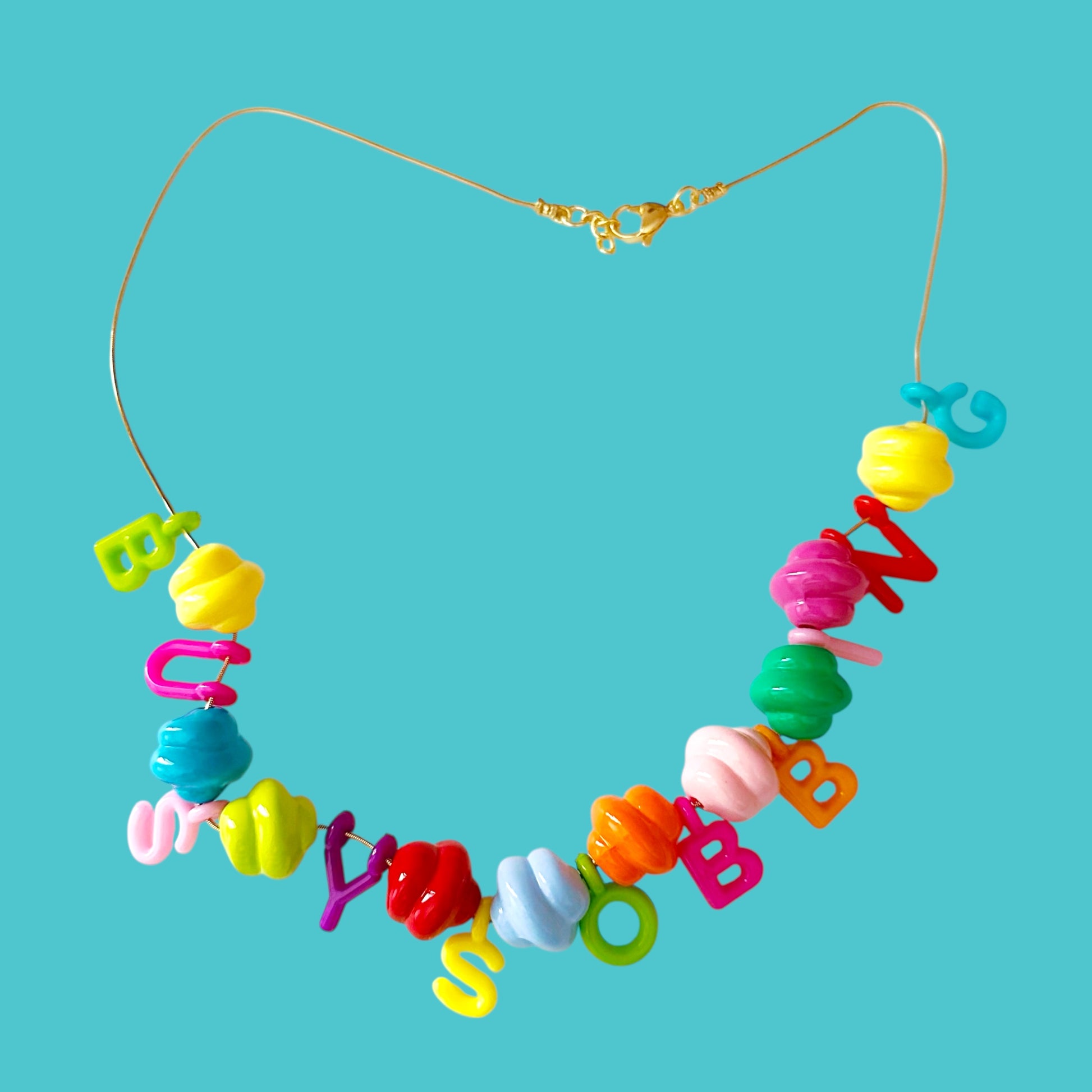 21" gold plated stainless steel chain and hardware, acrylic lettering and beads.