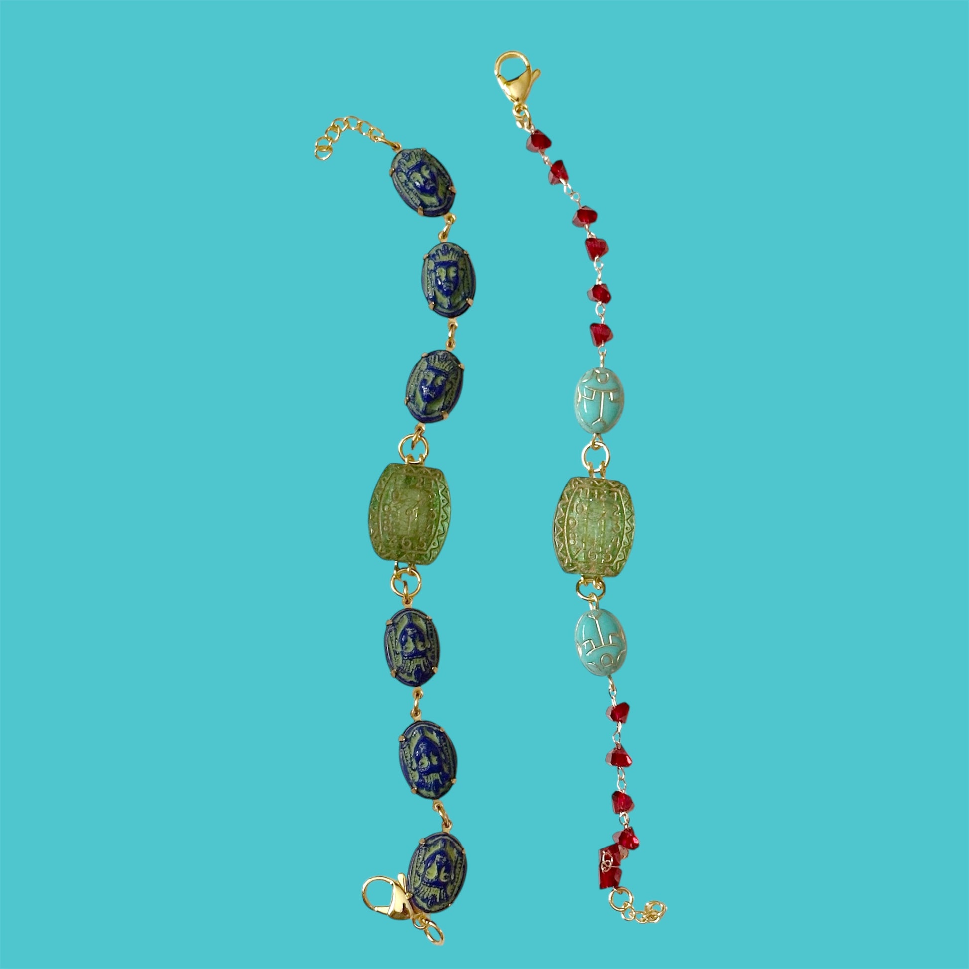 Style 4: Green watch face, scarab beads, red garnet chain, gold plated stainless steel hardware, 7.5".