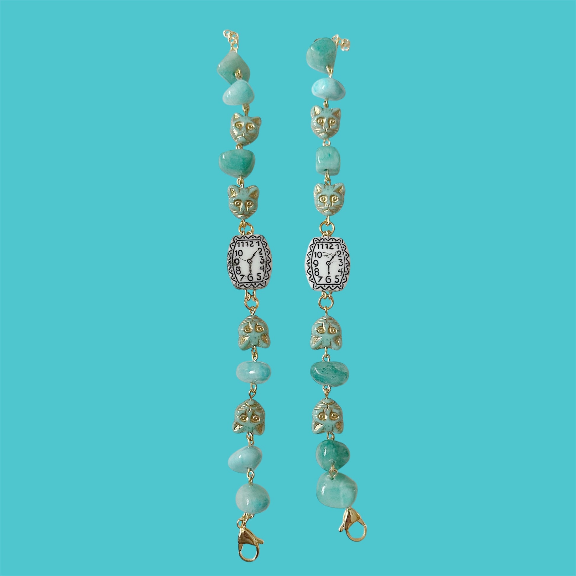 Style 1: White watch face, turquoise colored stones, vintage cat face charms, gold plated stainless steel hardware, 7.5".