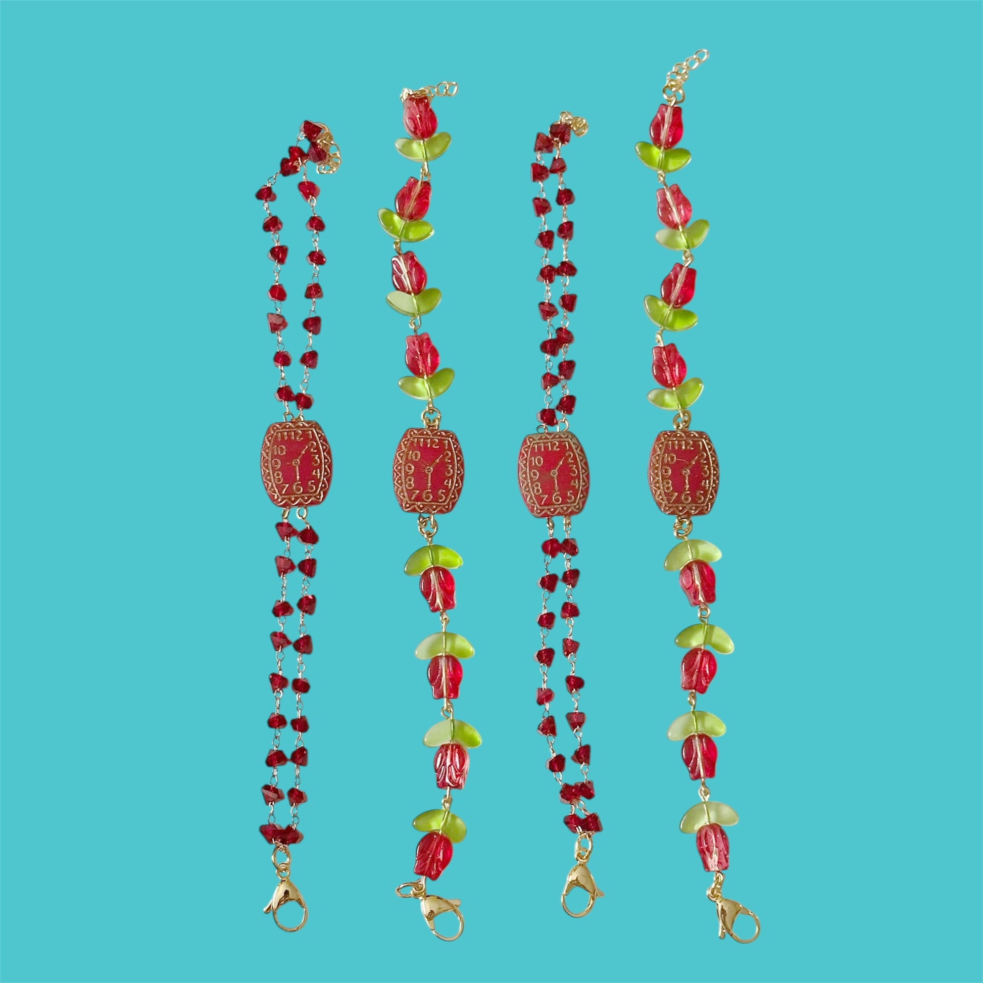 Style 6: Red watch face, red tulip beading, gold plated stainless steel chain, 8".