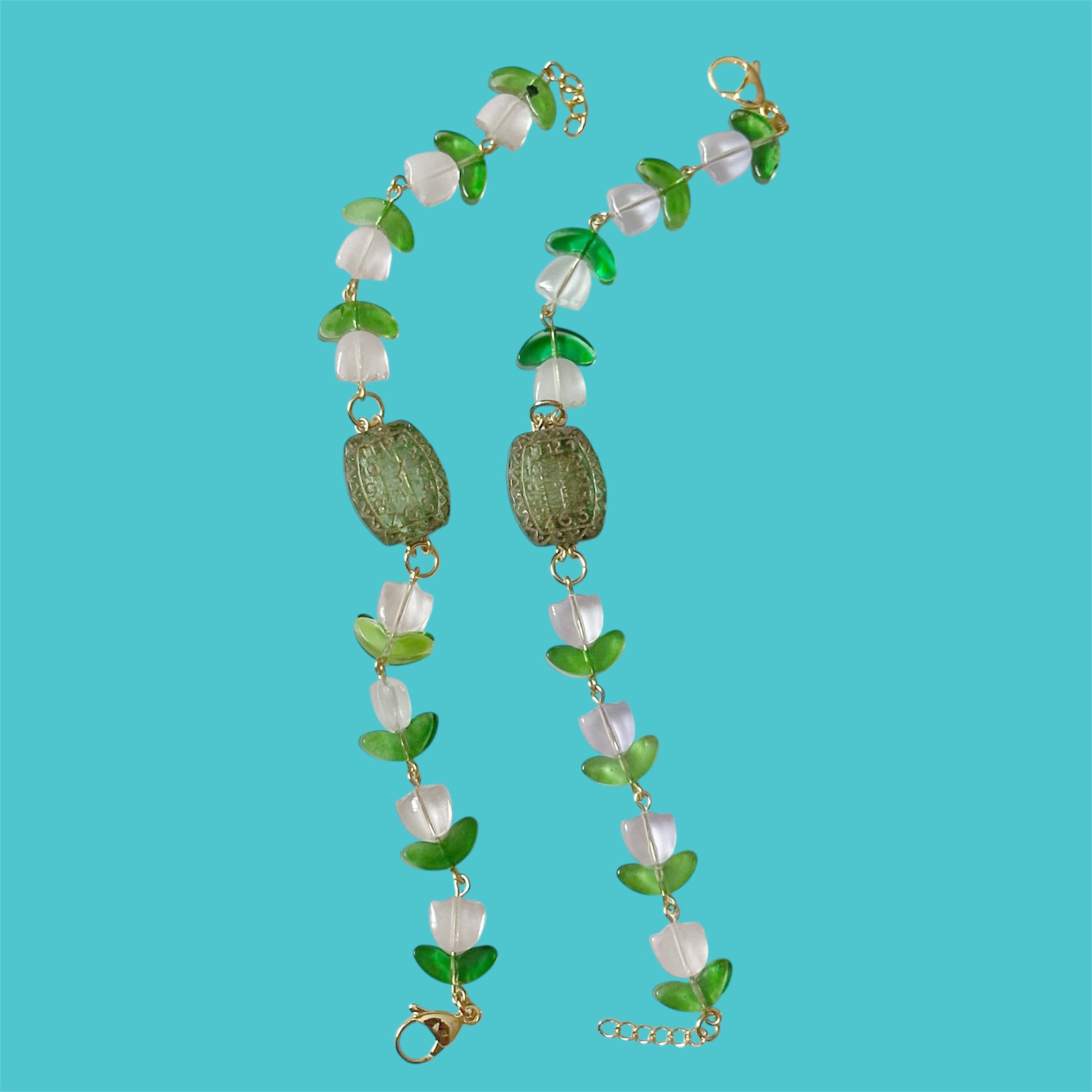 Style 7: Green watch face, white tulip beading, gold plated stainless steel hardware, 7-7.25".