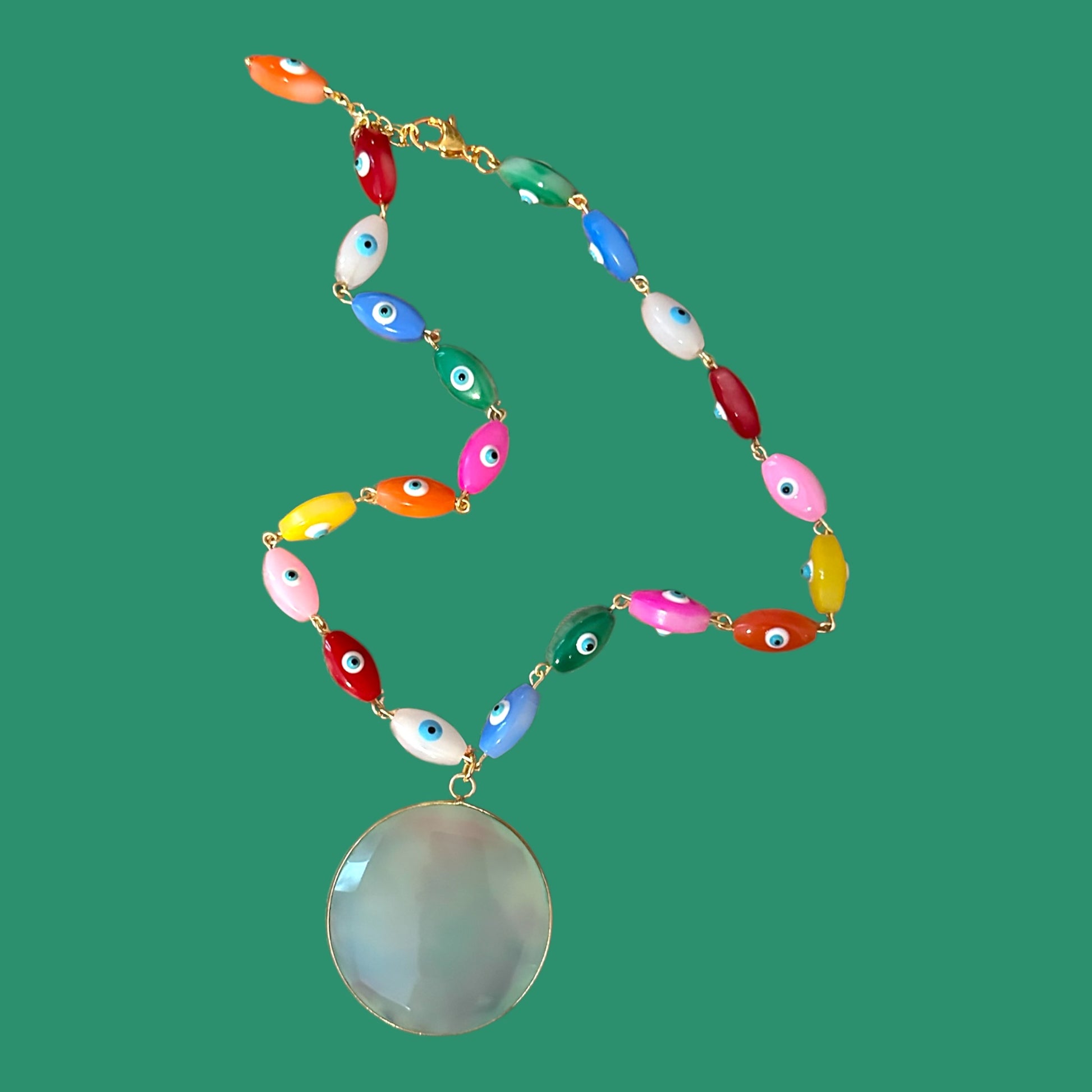 16inch beaded evil eye multi chain, gold plated Chalcedony pendant, gold plated stainless steel findings and hardware. One of one piece.