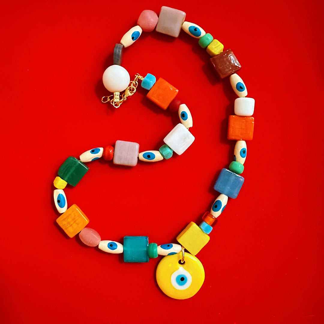 18.5 inch chain, gold plated stainless steel hardware and findings, multi colored sea glass beads, glass yellow pendant.