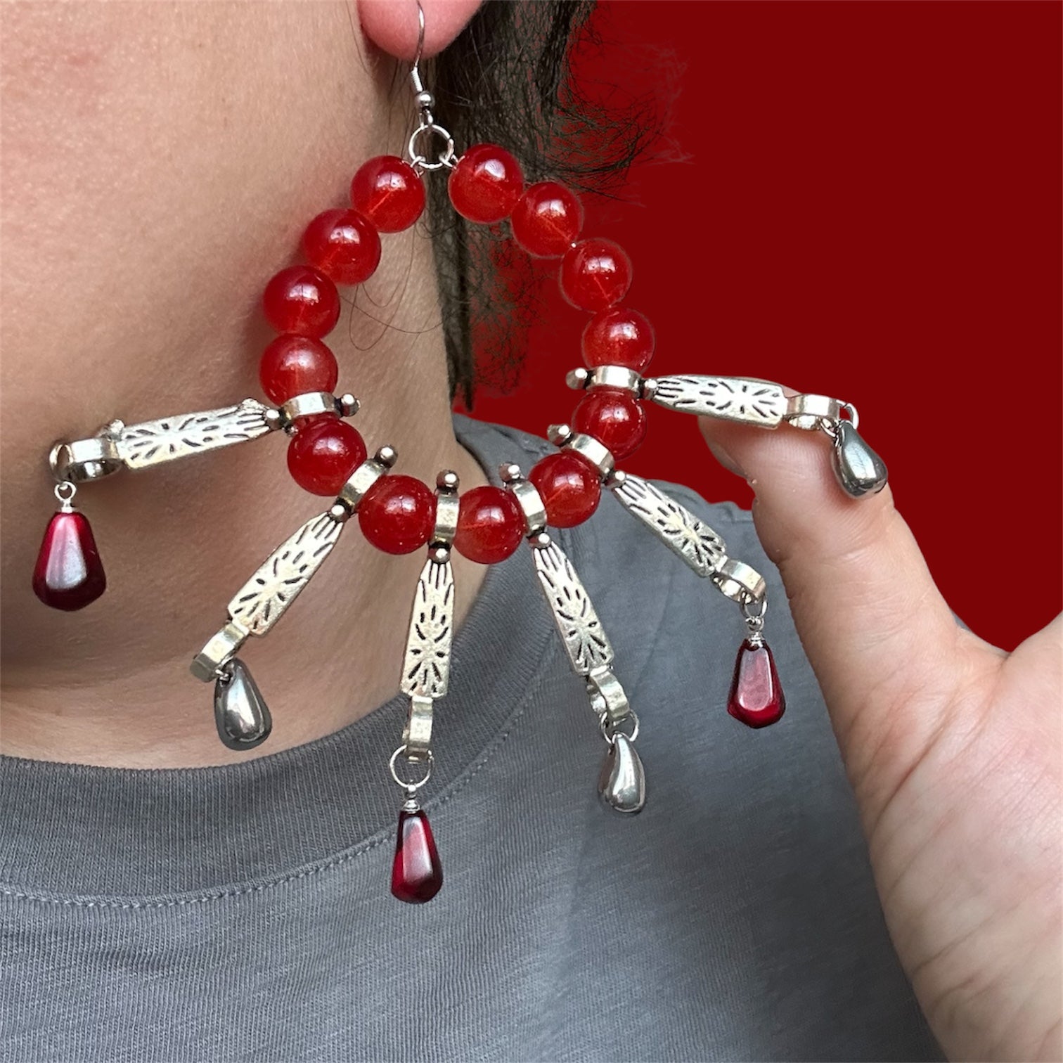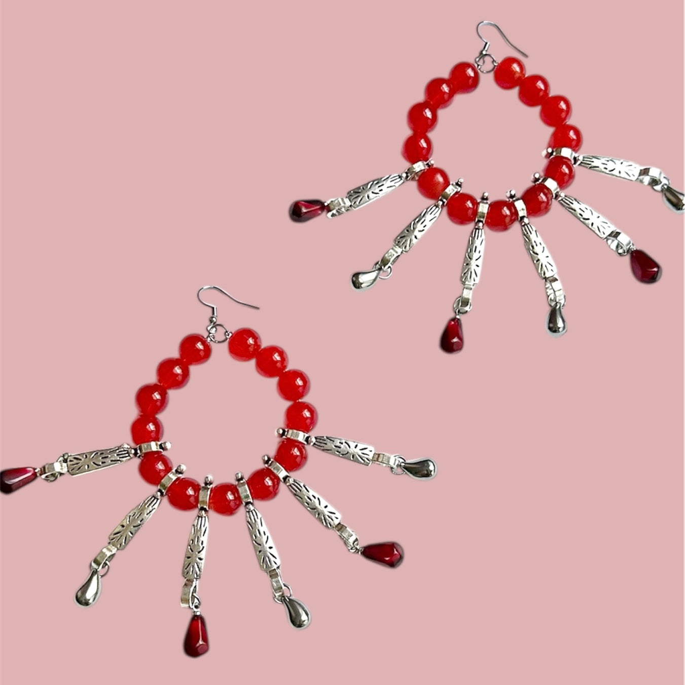 Beaded hoop earrings, red glass beading, silver details and charms throughout, resin silver pomegranate charms. Pair weighs 2.6oz/on heavier side.