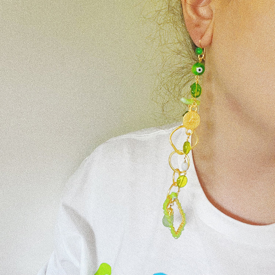 Green: Green Onyx Ear Hooks, sterling silver gold vermeil (18k gold finish), matte gold plated coin connector, glass beads, vintage frosted teardrop charm with filigree cap, matte gold plated disc chain, vintage shell inspired beads, gold plated pearl and peridot stone chain, Prehnite green wire wrapped base, gold plated hardware.