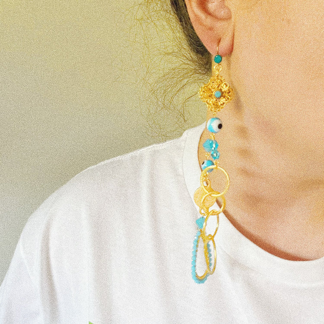 Blue: Chrysocolla gold vermeil (sterling silver plated with gold) ear hooks, matte gold plated coin connector, glass beads, matte gold plated disc chain, turquoise quartz teardrop base pendant, vintage Swarovski turquoise filigree pendant, gold plated hardware and findings.