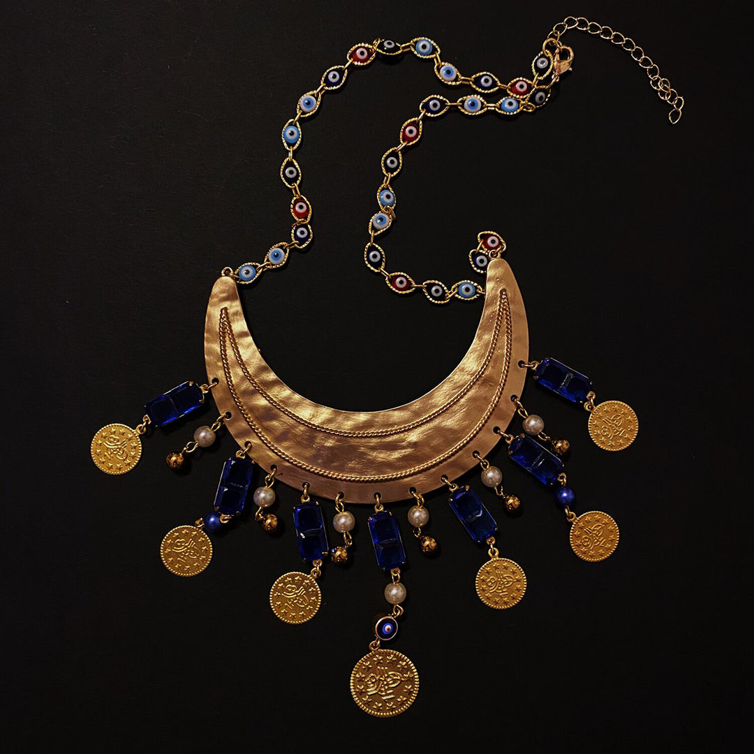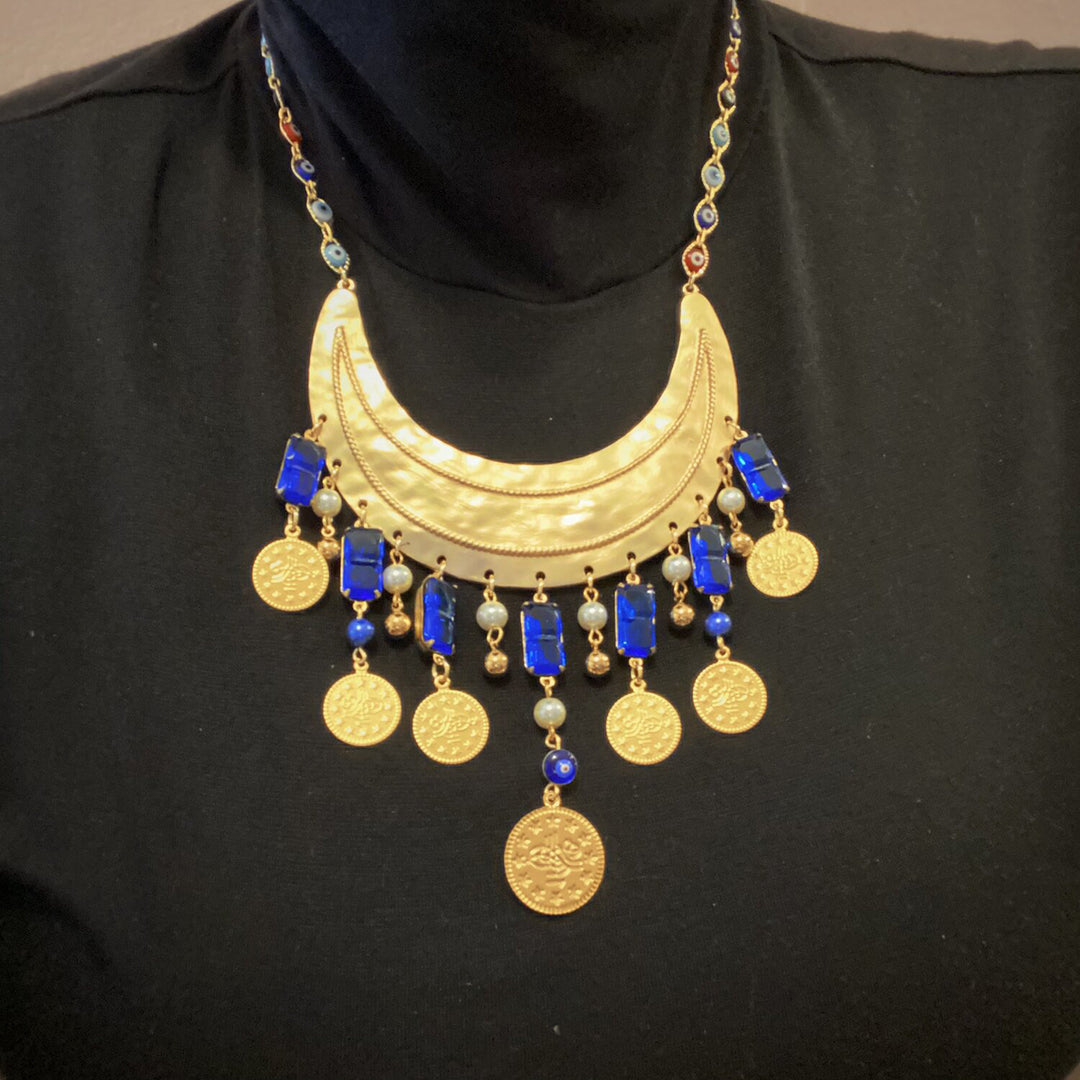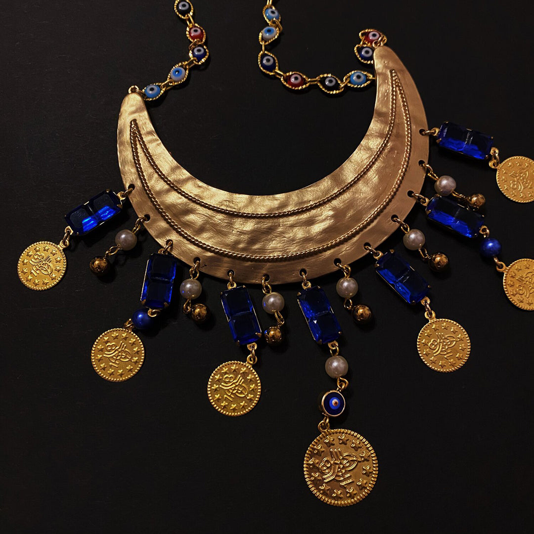 18k gold plated brass hardware, matte gold half moon connector, vintage Sapphire stones, gold plated wire wrapped pearls, lira coins from a bazaar in Kurdistan.