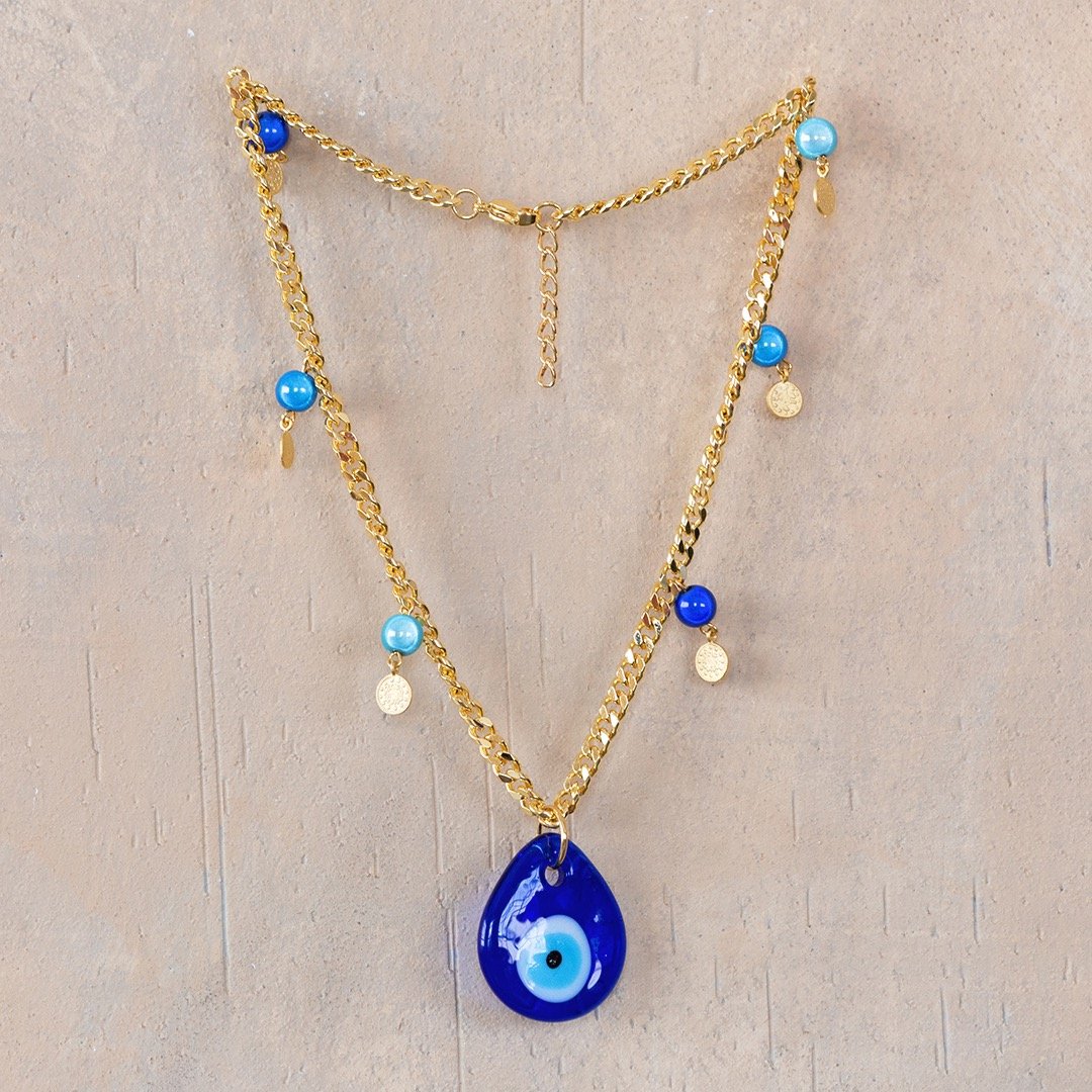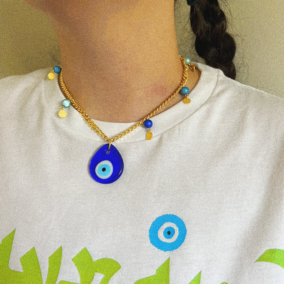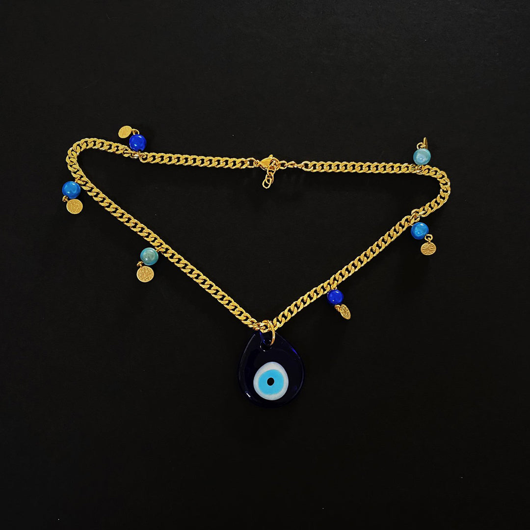 Gold plated stainless steel chain and hardware, matte gold plated mini coin charms, “miracle beads” in alternating shades, 15.5 inch chain with extension as well, teardrop glass eye charm.