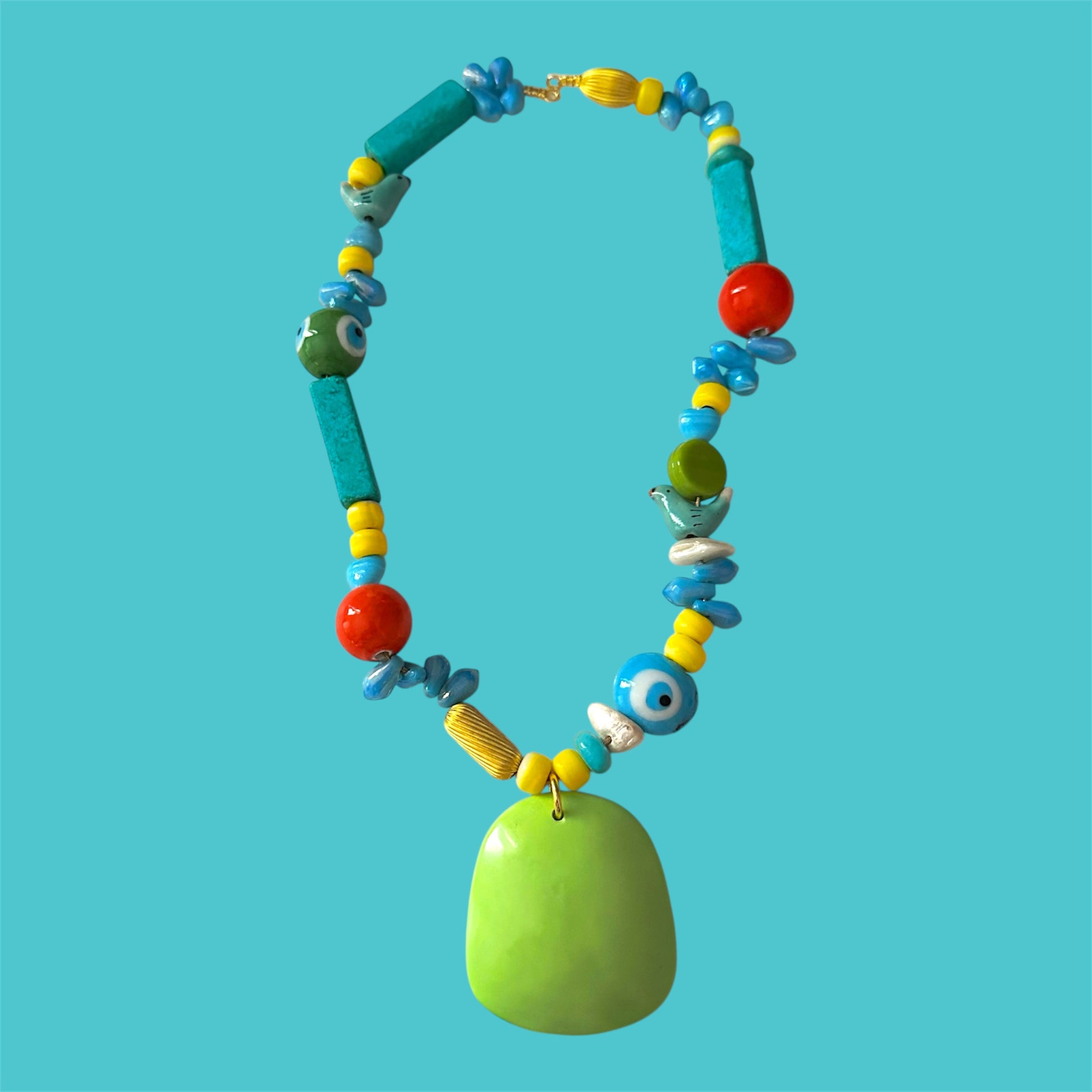 19", gold plated stainless steel hardware and findings, assorted ceramic, metal, glass and stone beading.