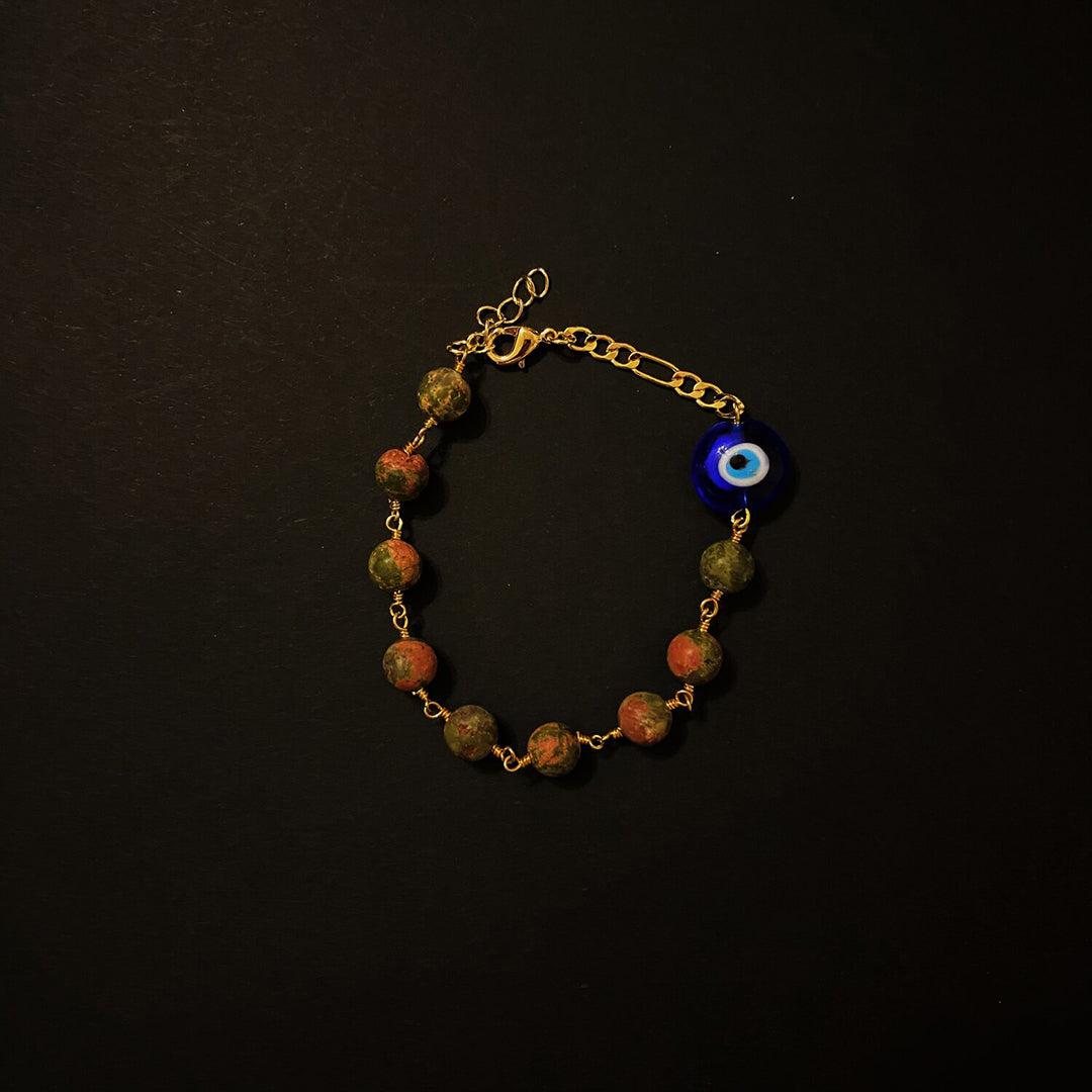7.5 inch bracelet with extension, if smaller size desired mention in notes at checkout your inch preference. Unakite beads with gold plated wire wrapping, 18k gold plated brass Figaro chain, nazar glass bead.
