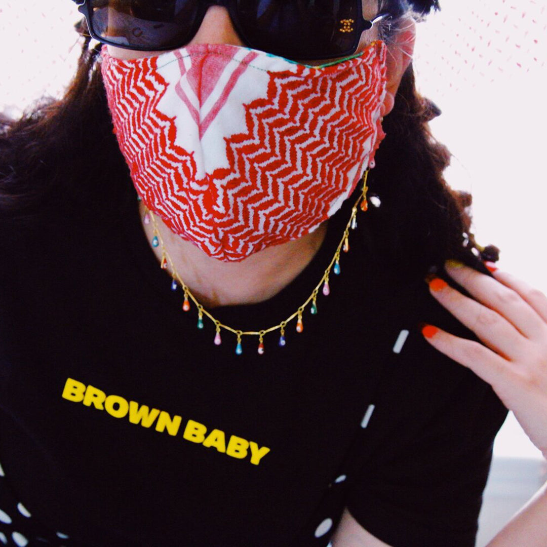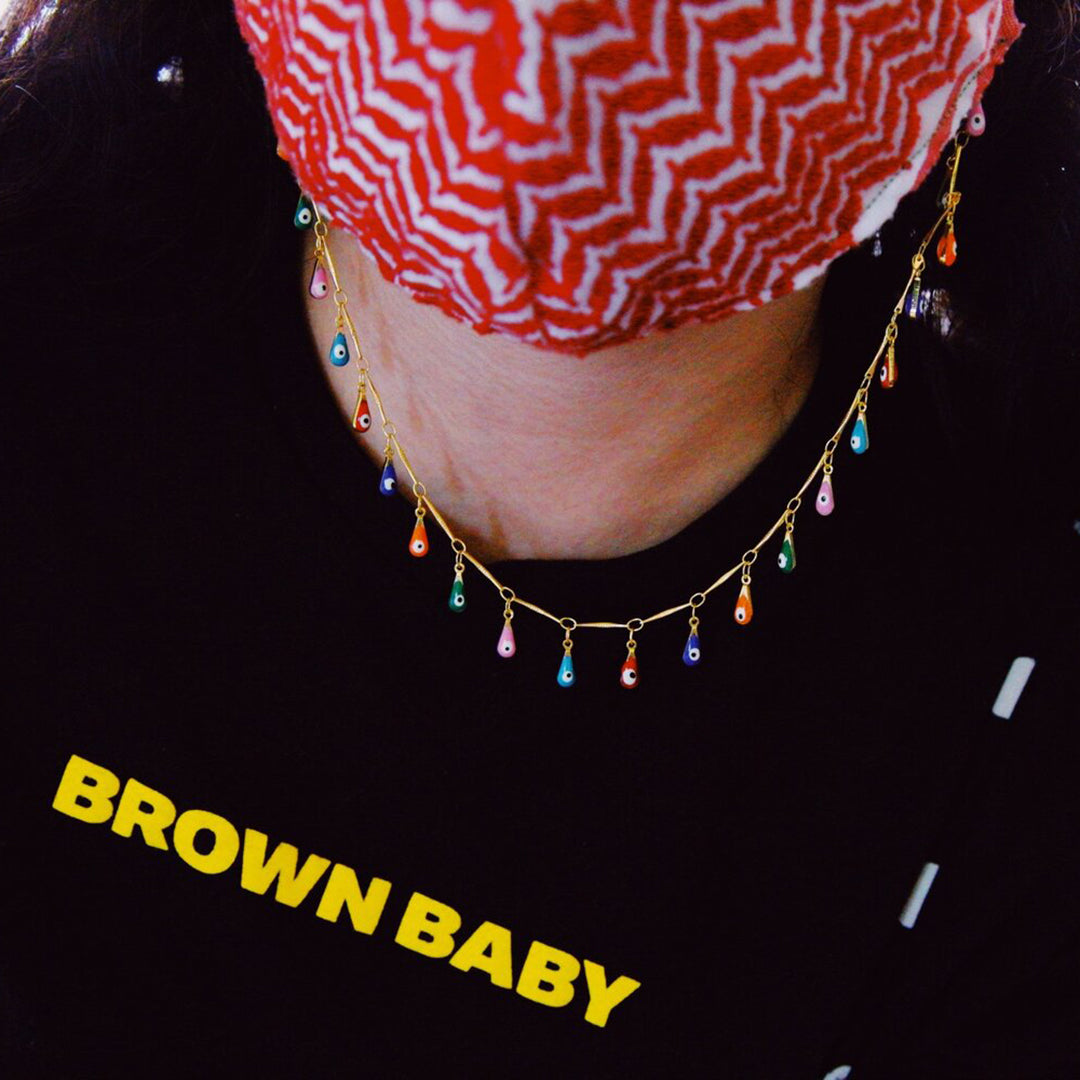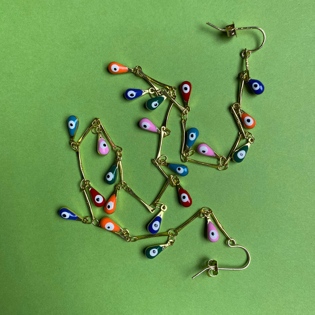 An ear to ear connector, gold plated brass hardware with brass in enamel teardrops.