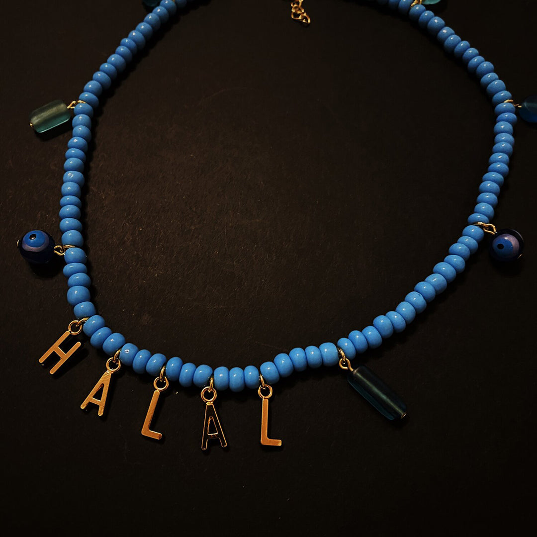 Light blue beads, gold plated lettering, sea glass stones and evil eye beads, 18k gold plated brass hardware.