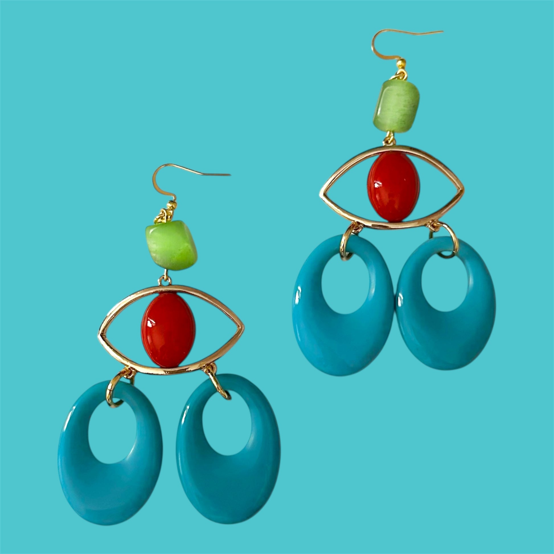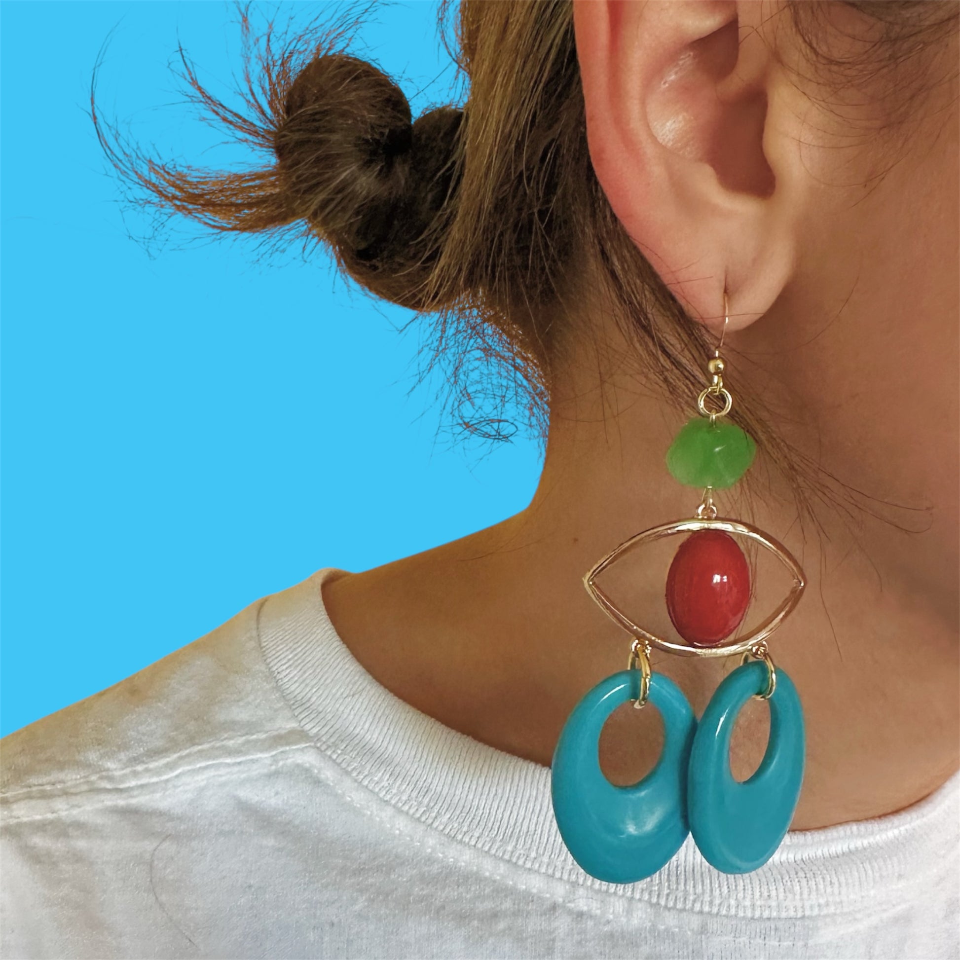 Gold plated stainless steel hardware and findings, fiber optic beads, glass pendants. Pair weighs 1.3 oz.