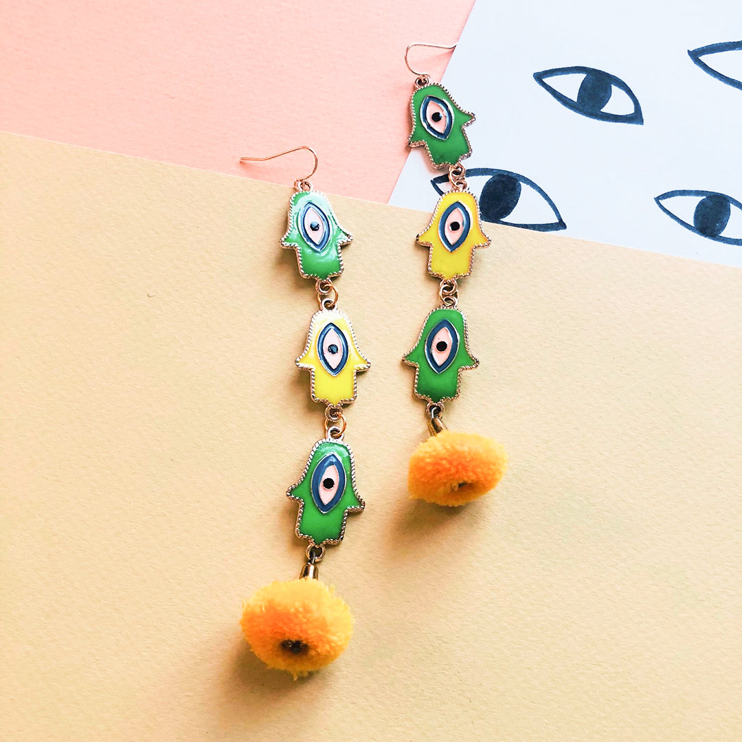 Gold plated hardware, enamel filled Hamsa hands, pom charm.