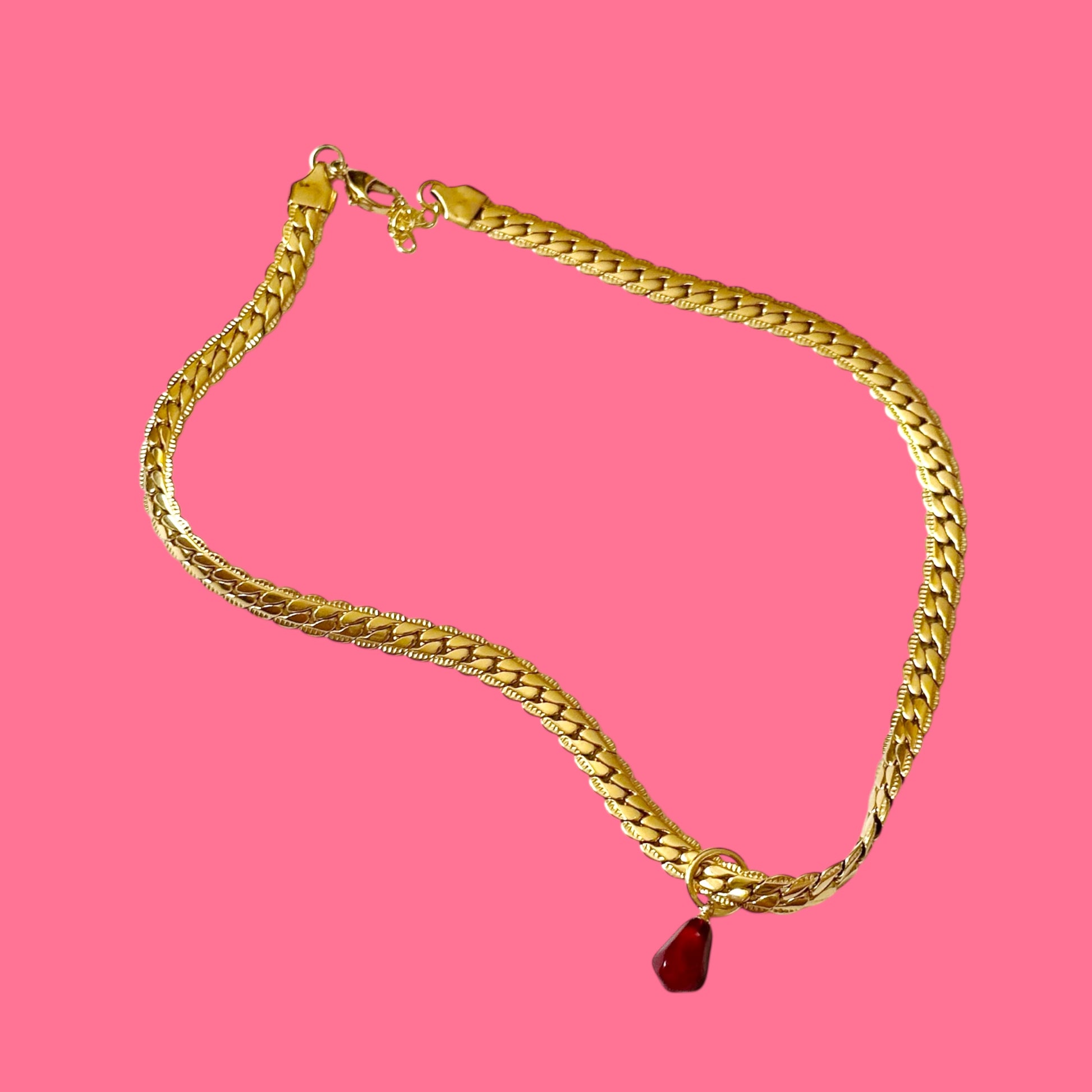 15inch gold plated stainless steel Cuban chain style, pomegranate seed charm, gold plated stainless steel hardware.