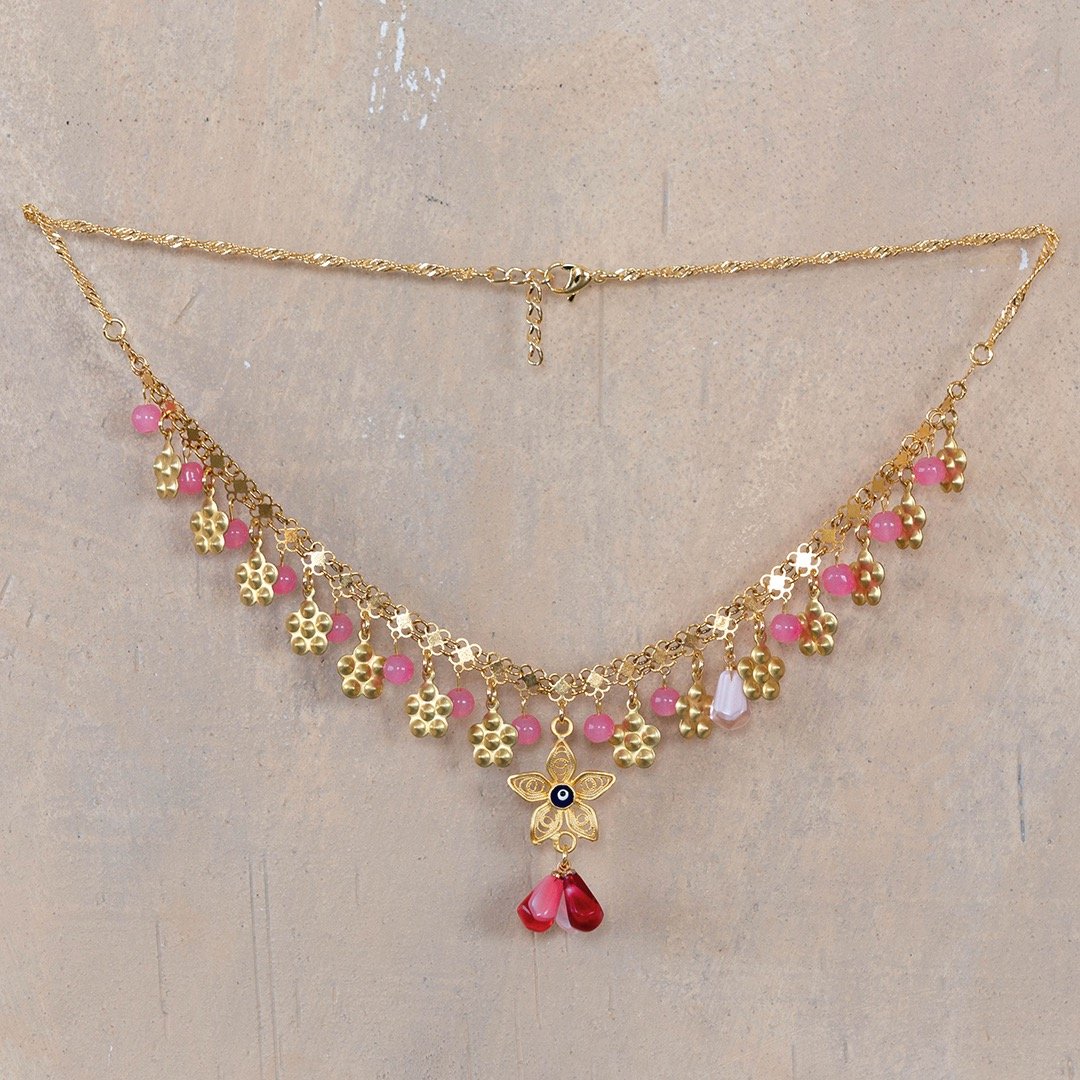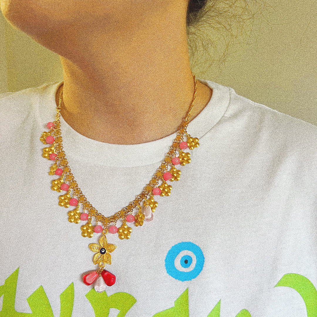 Gold plated chain and hardware, pink glass beads, three contrasting pomegranate charms made of resin, vintage flower stamped charms, gold plated evil eye flower pendant, 19 inch chain with extension.