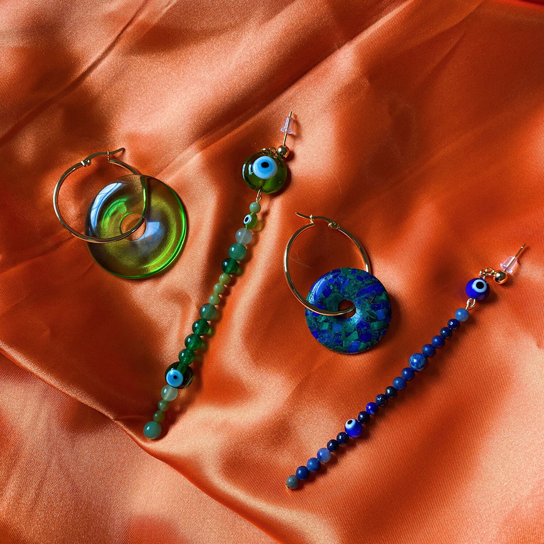 18k gold plated brass hoops and hardware. Assortment of lapis, aventurine, dyed jade and glass beads. Mismatch style.