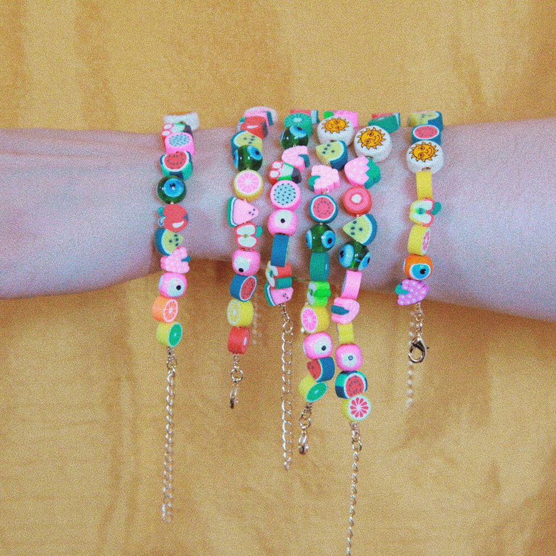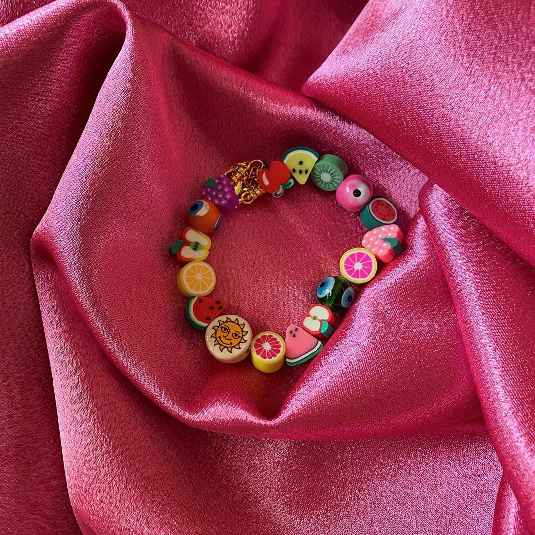 6.5 inches with extension. Mixture of fruit, eye and sun beads.