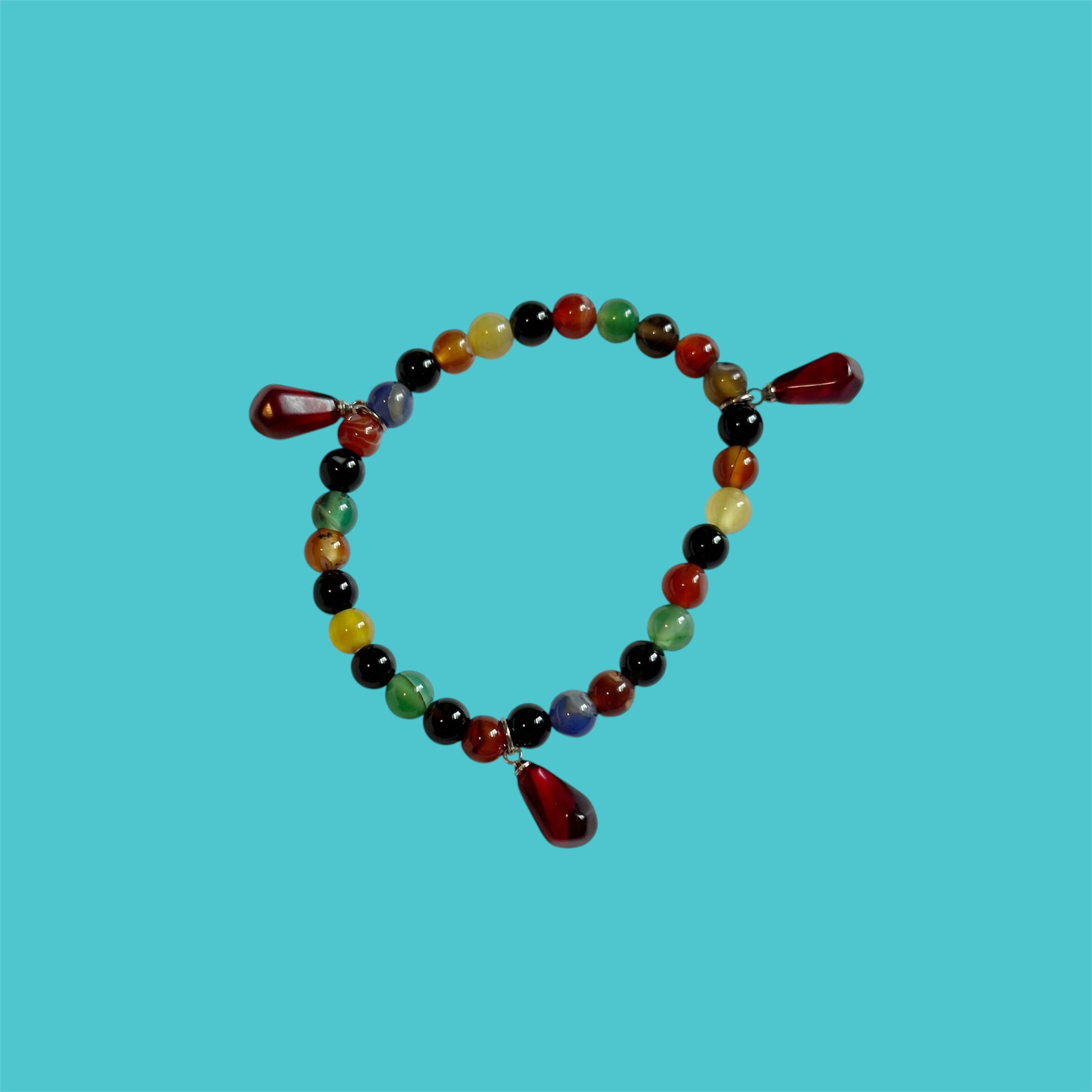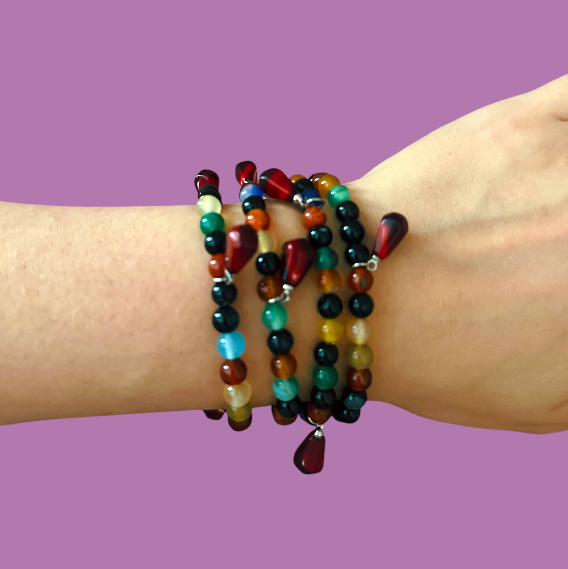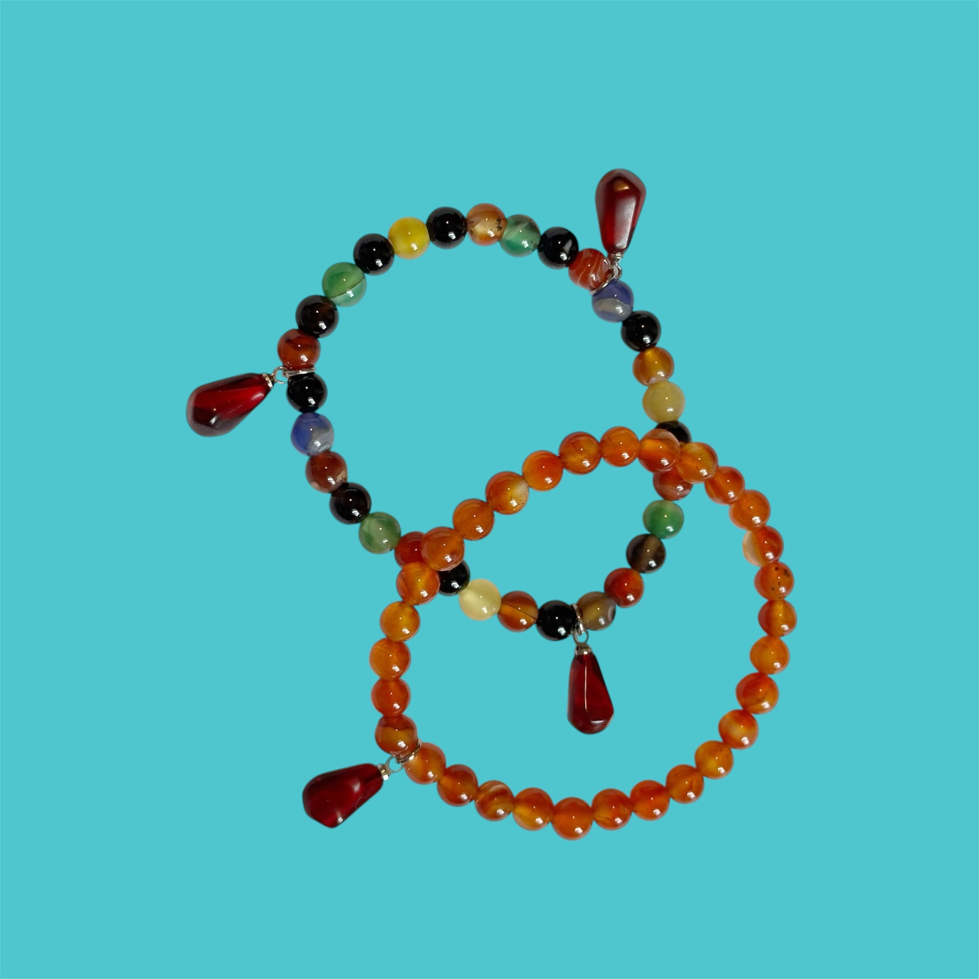 Beaded stone bracelets/elastic, silver details/silver pomegranate seed charms.