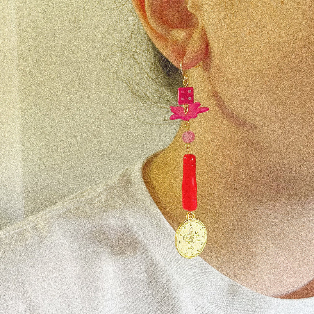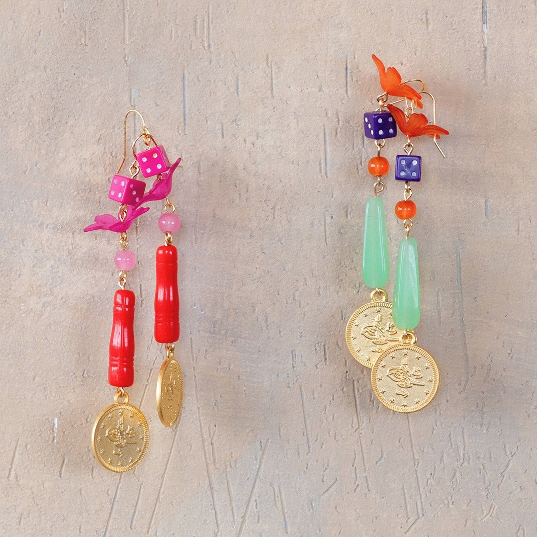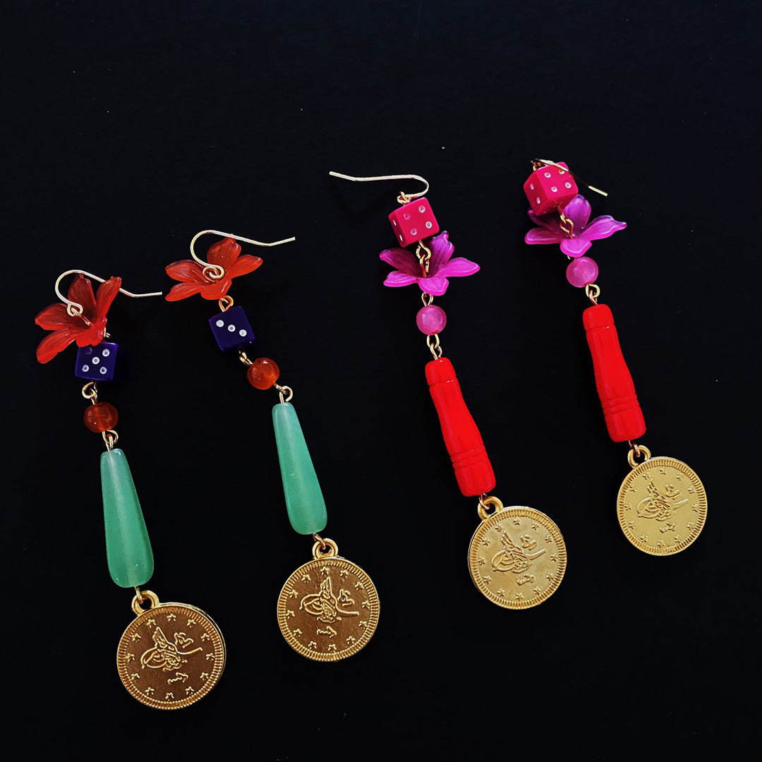 Gold plated hardware and findings, matte gold plated coin charms, acrylic daffodil beads, glass beads, acrylic dice beads. Pair weighs 0.4 ounces.