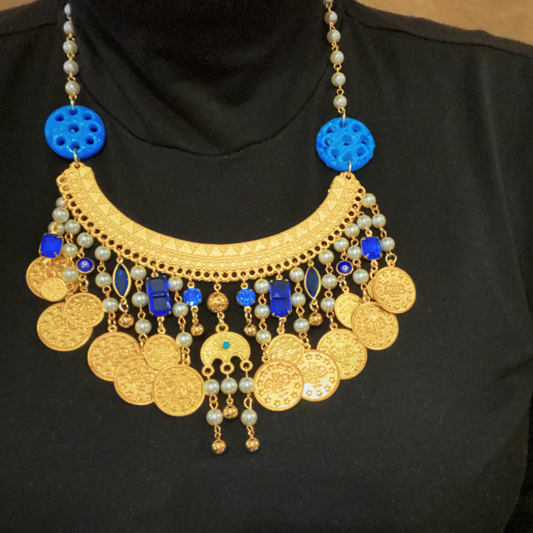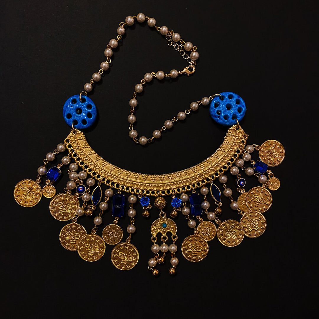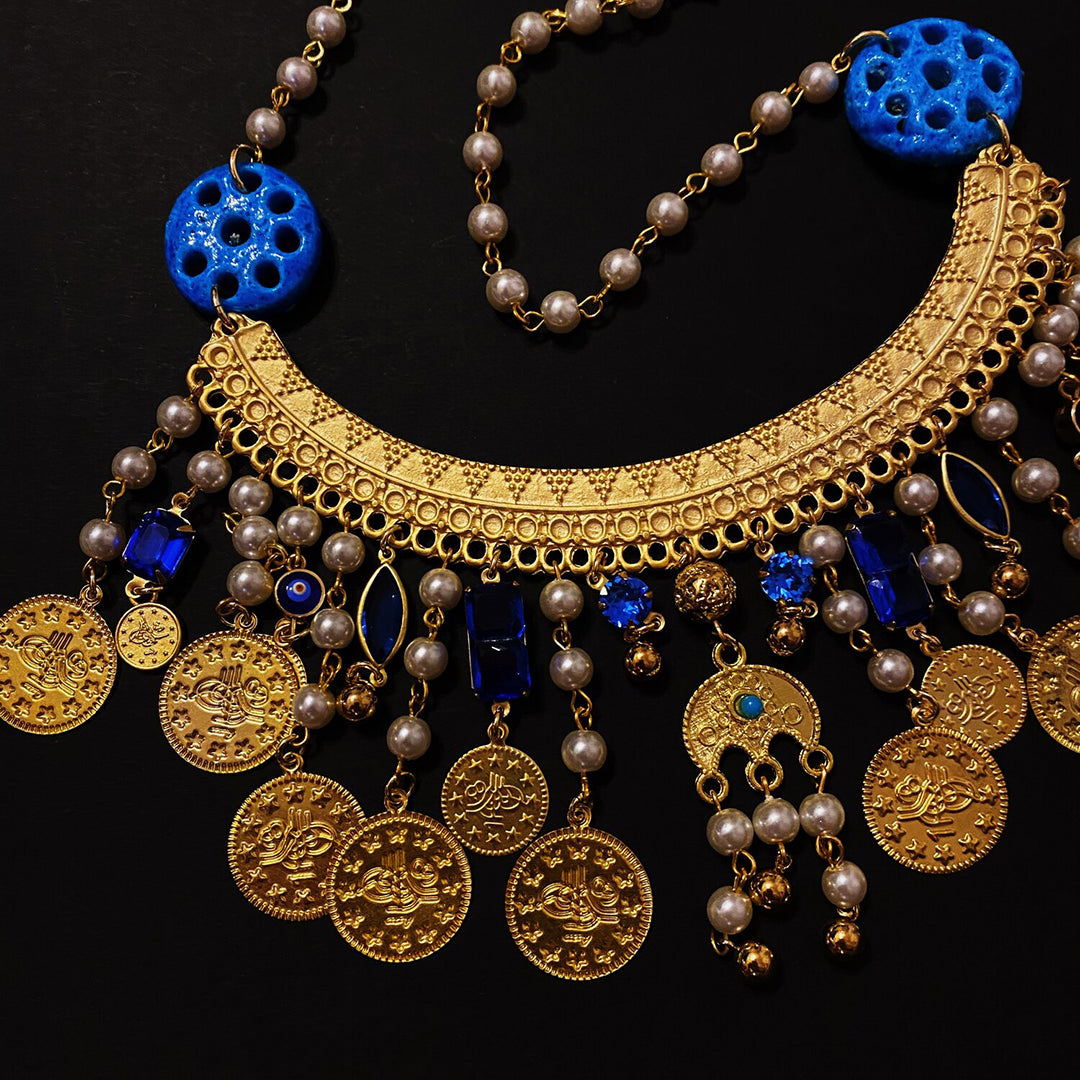 Matte gold plated pendant, gold plated pearl rosary chain, lira coins from the bazaar in Kurdistan, blue sapphire stones in brass setting, blue Kuzhaka beads and Sarpacham charm from the Kurdish markets, 18k gold plated hardware. Weighs 3.1 ounce.