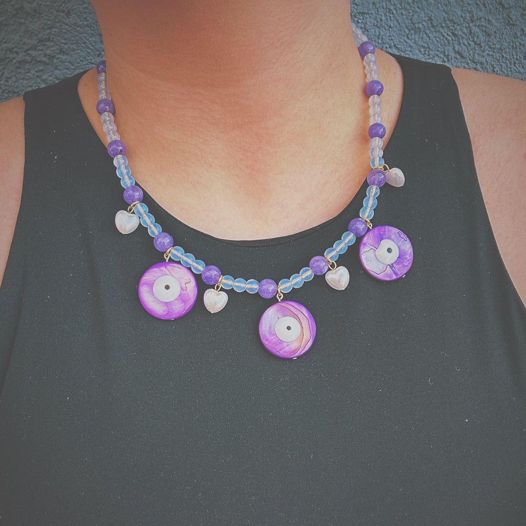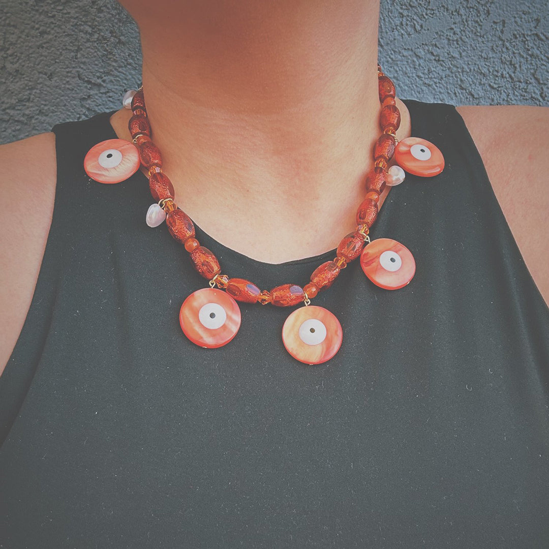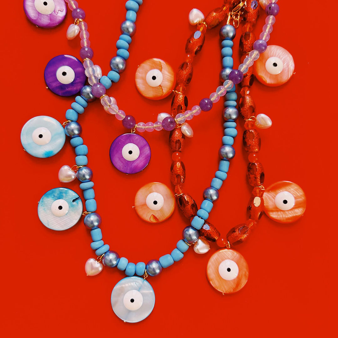 All have gold plated stainless steel hardware and findings, 17inches each with additional extensions and mother of pearl dyed eye beads, assorted opal, glass, pearl and seed beads throughout.