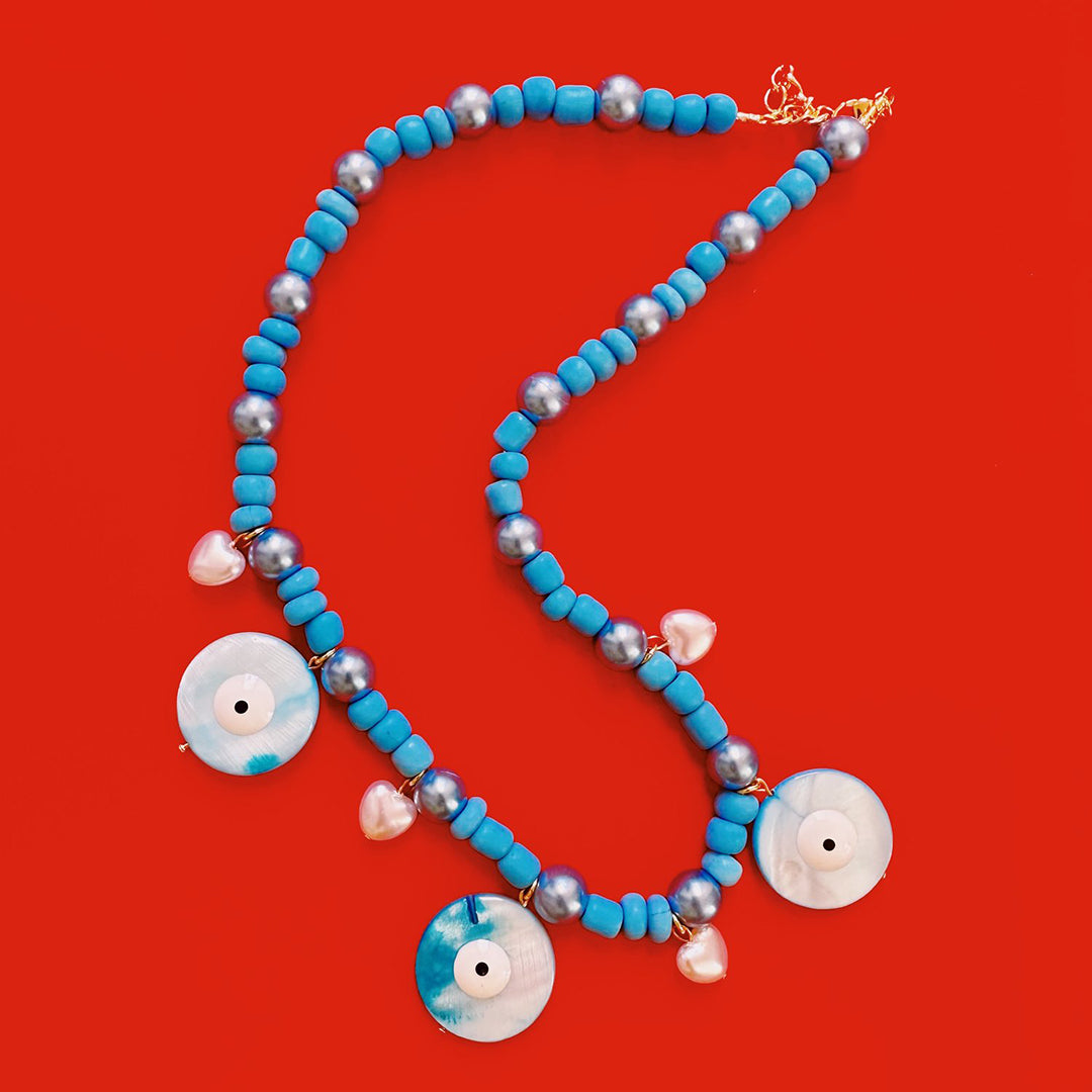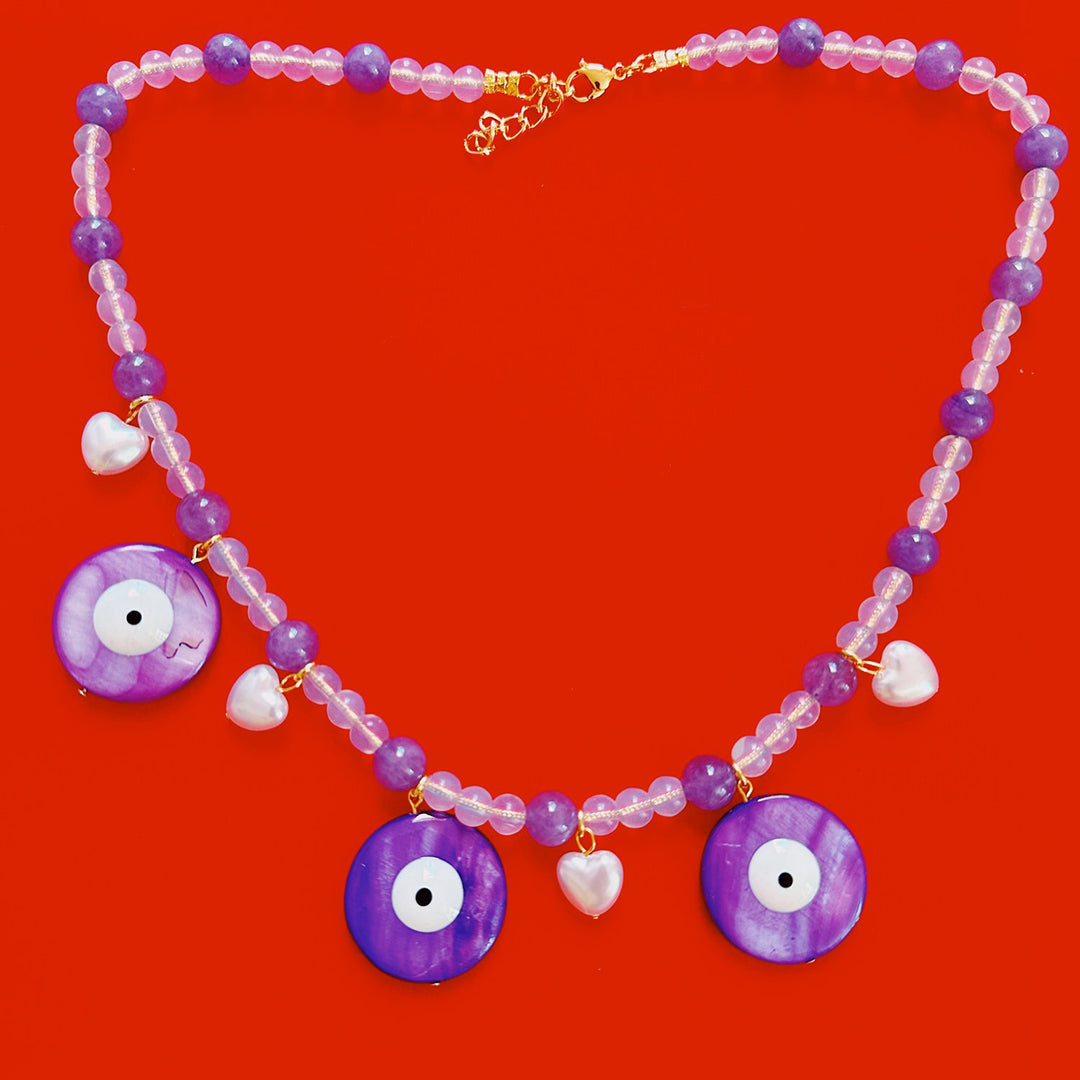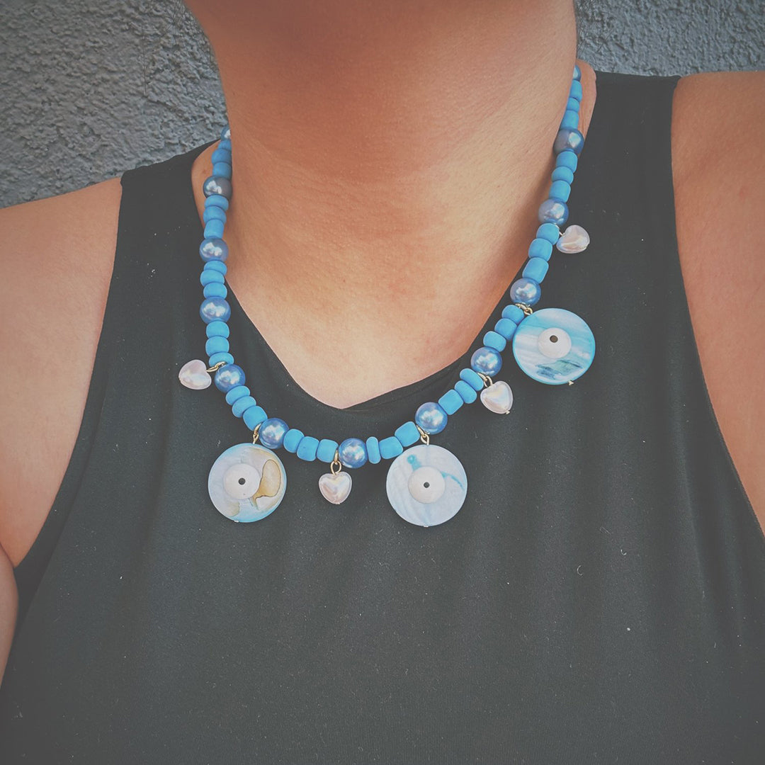 All have gold plated stainless steel hardware and findings, 17inches each with additional extensions and mother of pearl dyed eye beads, assorted opal, glass, pearl and seed beads throughout.