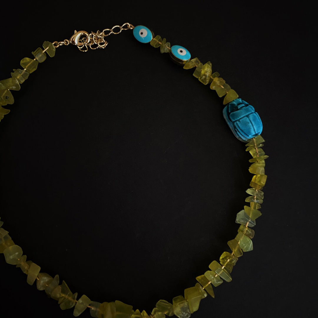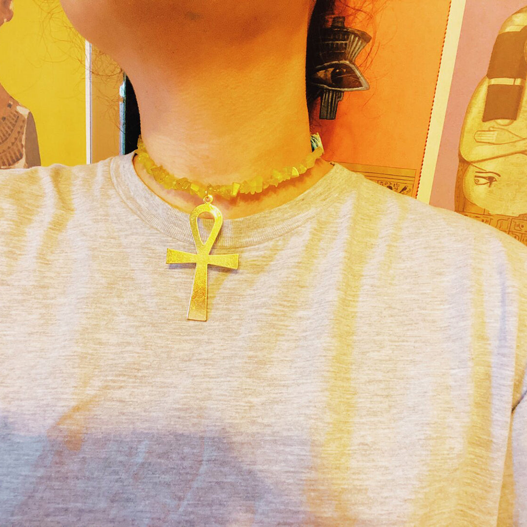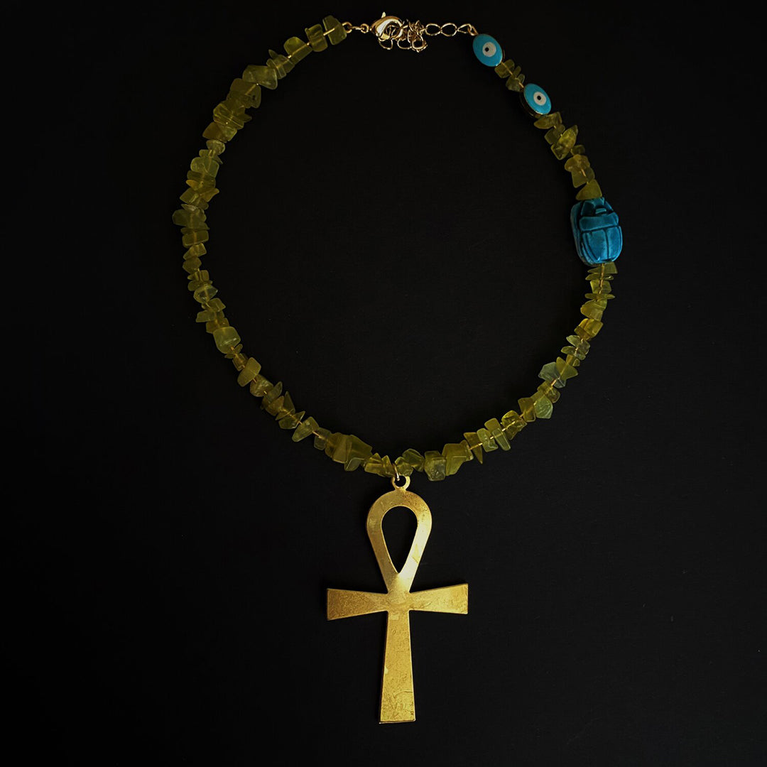Gold plated hardware, Korean jade, vintage scarab bead, raw brass oversized Ankh.