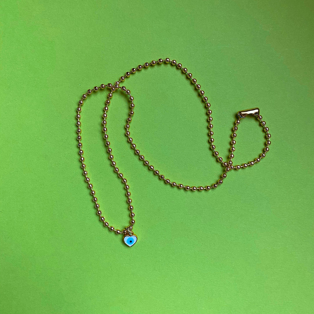18k gold plated ball chain necklace and evil eye heart charm. 16/17 inch chain length.