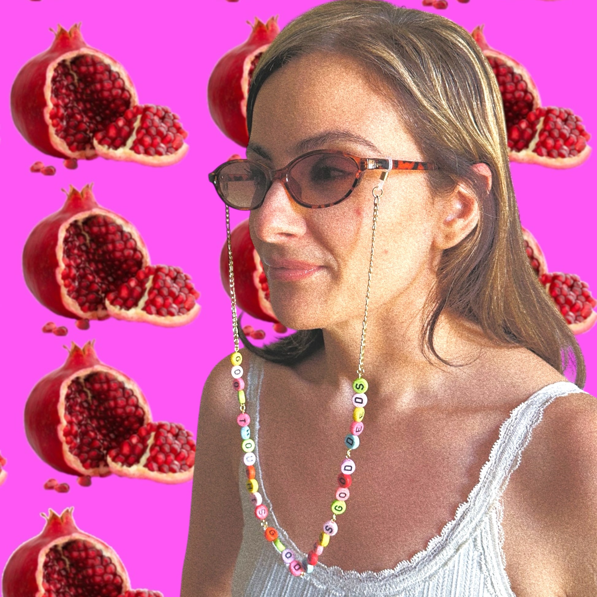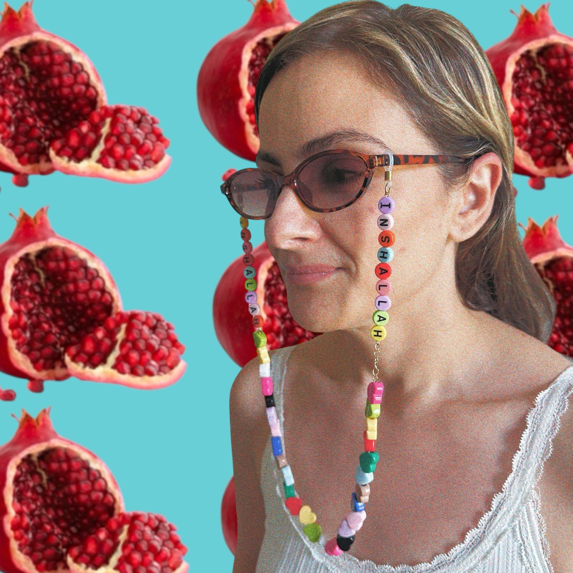 Acrylic beading and lettering, stainless steel hardware and findings.