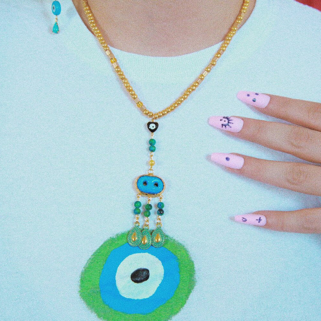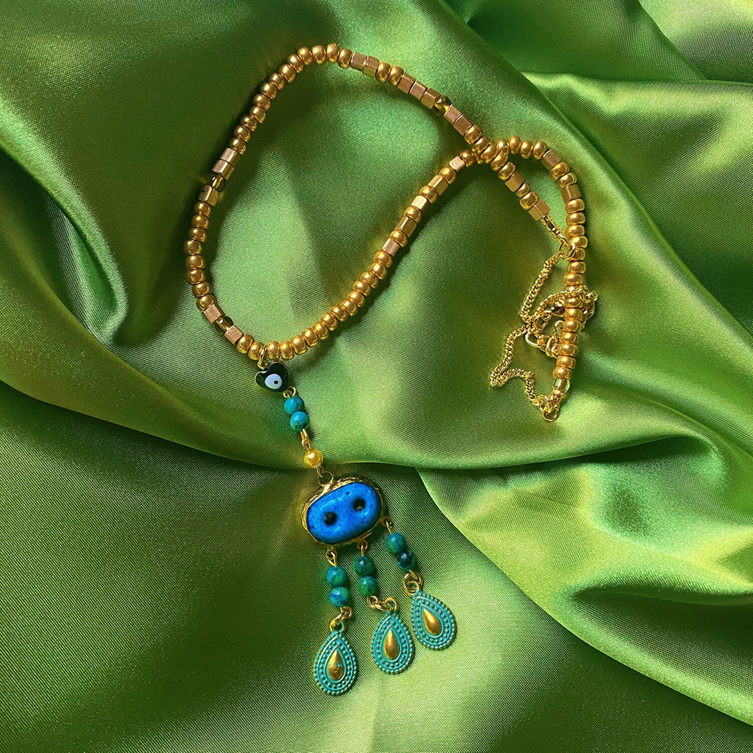 Gold plated brass findings and hardware, Czech glass and gold seed beads, kuzhaka in gold plated setting charm from Kurdistan, vintage patina teardrop shaped charms, and mini chrysocolla beads. 16 inch chain with extension.