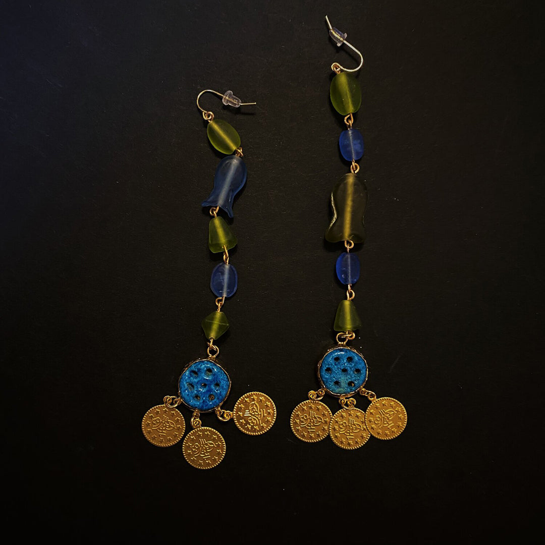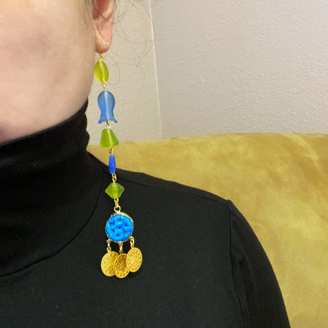 Gold plated hardware, collection of sea glass beads from a small shop in Texas, Kuzhaka evil eye charm with gold plating and gold lira coins from the bazaar in Kurdistan. Pair weighs 1oz.