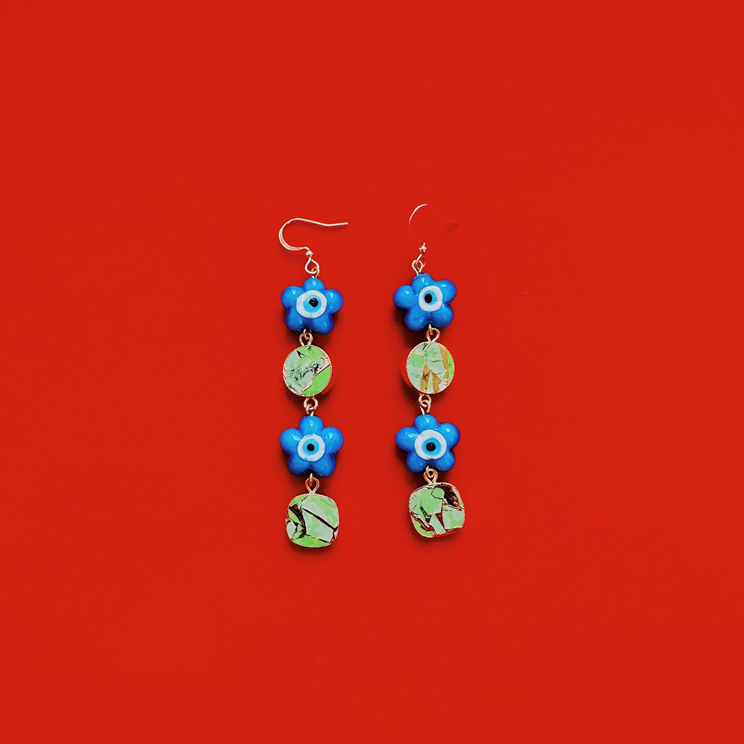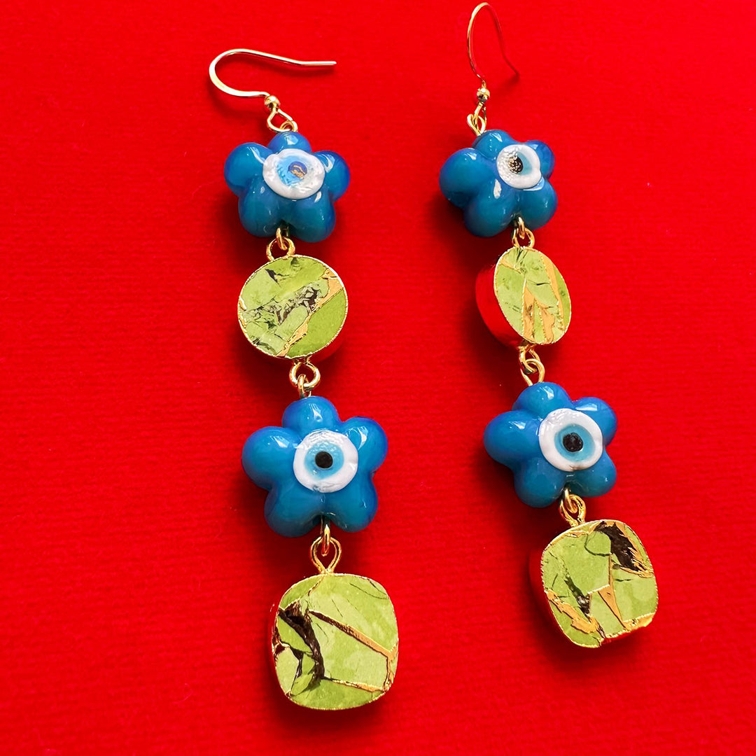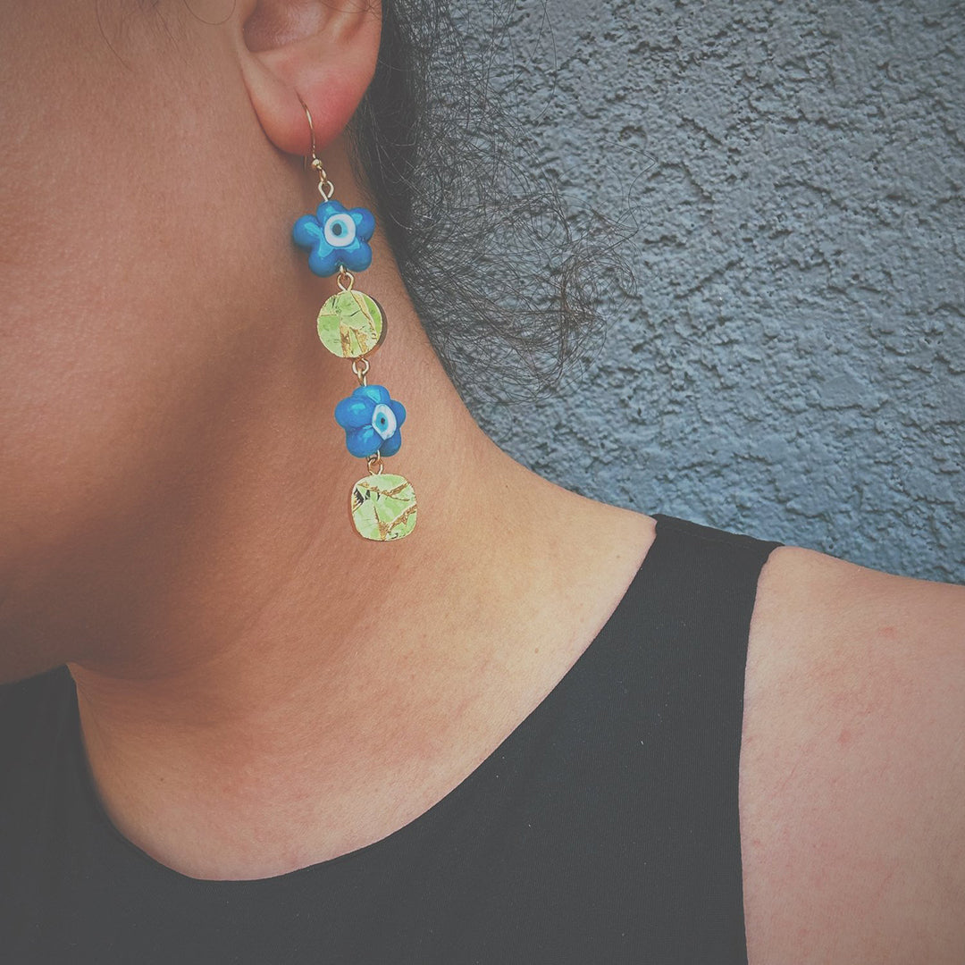 Glass blue flower beads, 24k Gold Electroplated Peridot gemstones, gold plated stainless steel hardware. Pair weighs 0.4 ounces.