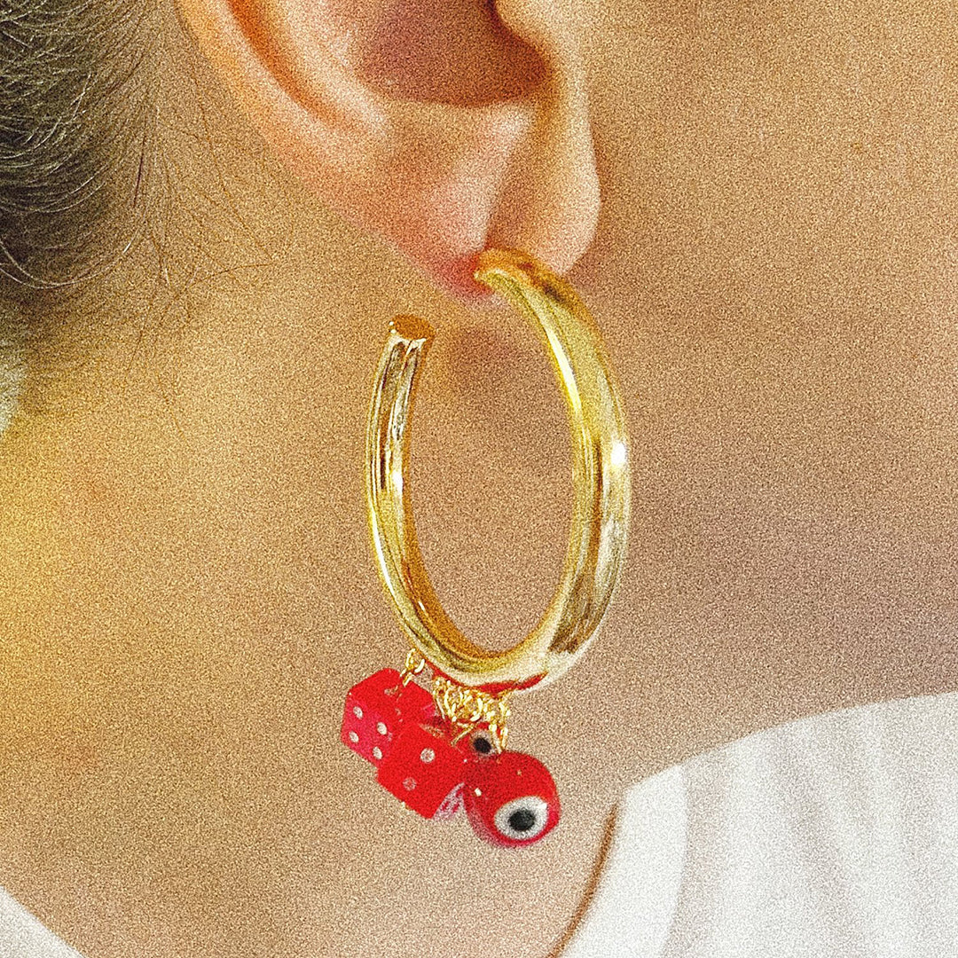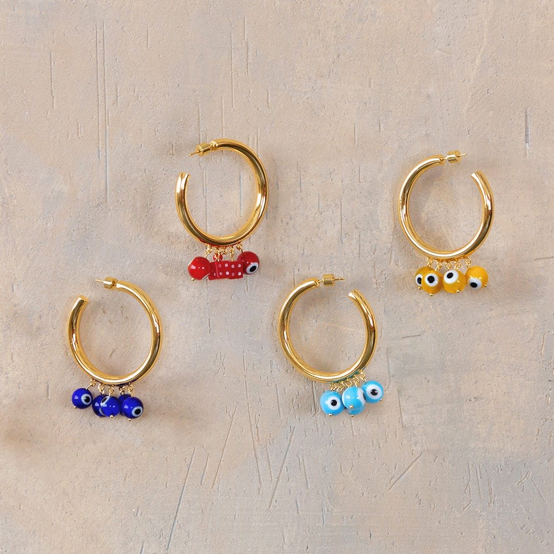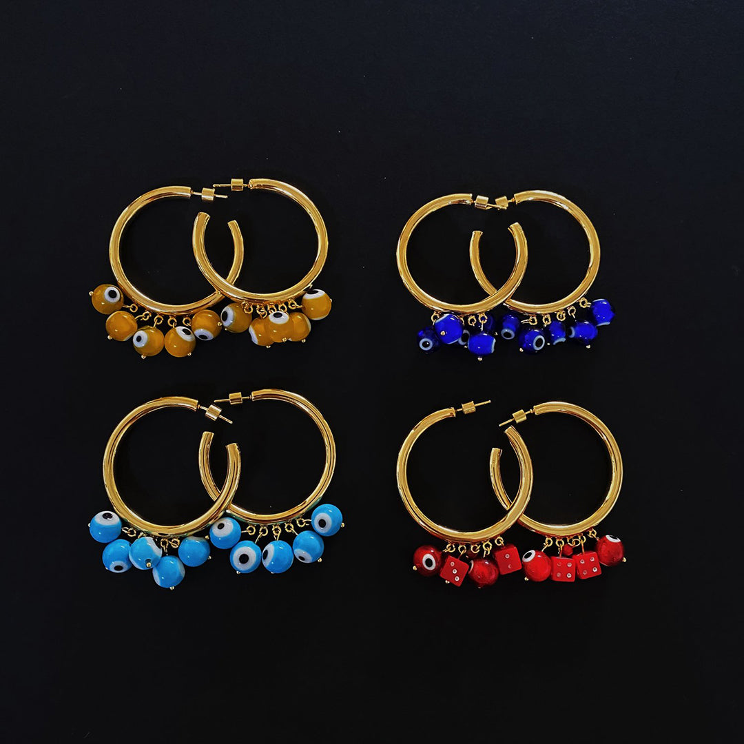 18k gold plated brass hoop earrings, glass evil eye beads, gold plated hardware. Pair weighs 0.6 ounces.