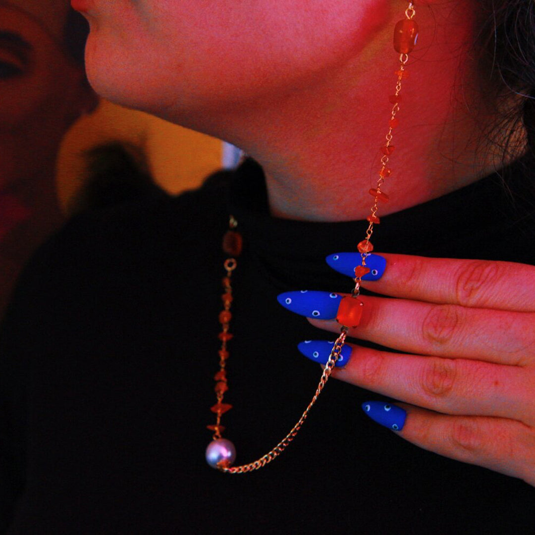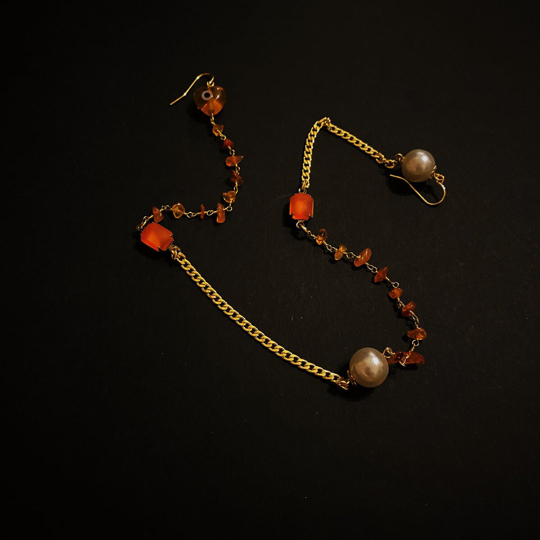 Hook to Hook - Orange color way 16.5 inches, gold plated stainless steel chain, carnelian nugget chain with gold plated wire wrap, vintage brass set orange stones, gold plated ear hooks.