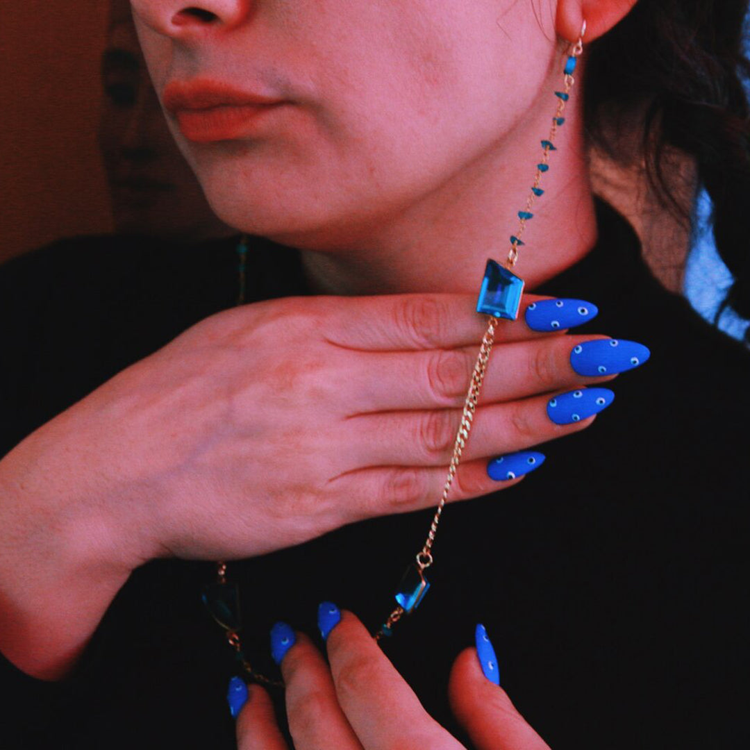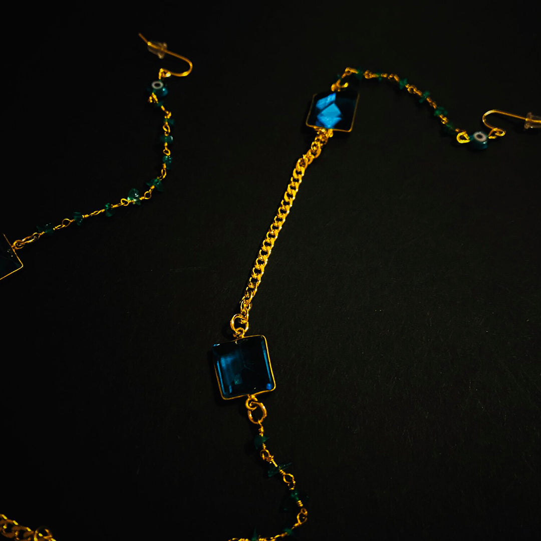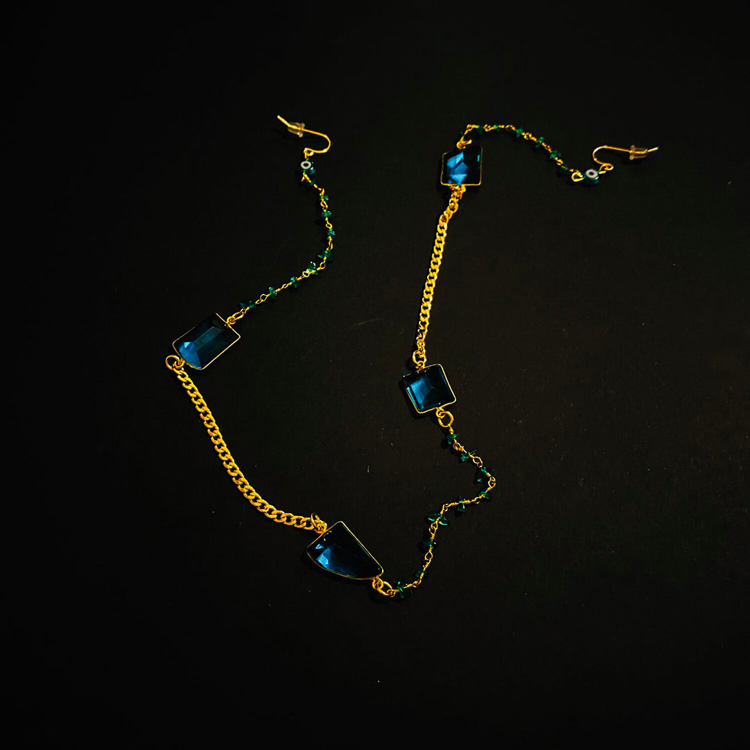 Hook to Hook - Green/Turq color way 18inches, 24k gold plated Blue Topaz Fancy Cut, gold plated stainless steel chain, green onyx nugget chain with gold plated wire wrap, gold plated ear hooks.
