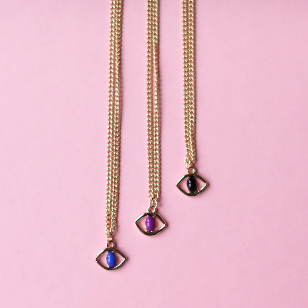 Gold plated hardware with eye charm. 16 inch chain. Comes with extension to make longer/shorter.