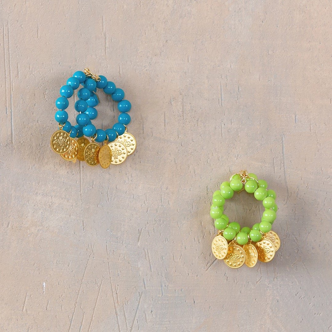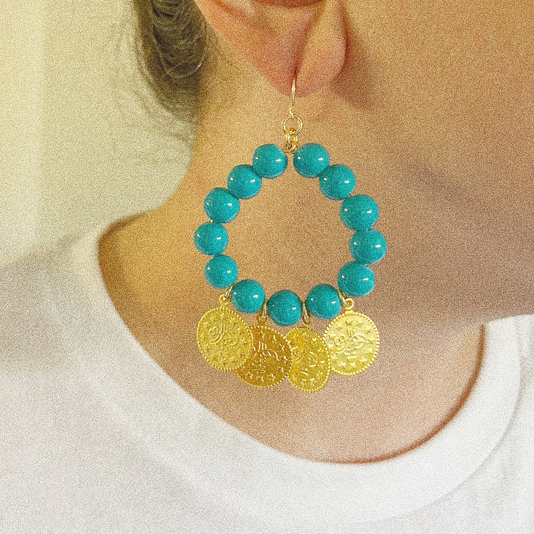Metal vintage coins from Kurdistan, acrylic beads in lime green or turquoise, gold plated hardware. Pair weighs 0.7 ounces.
