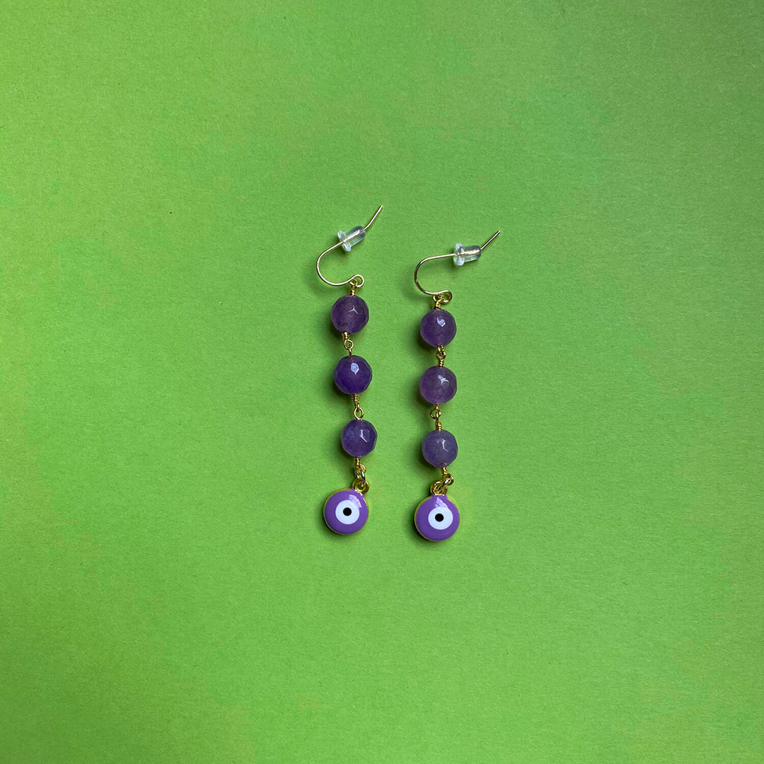 Light lavender jade beads with 24k gold plated wire wrapping, gold plated hardware, purple metal alloy eye charm.