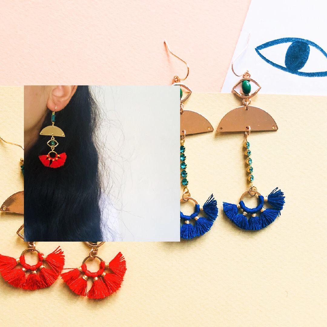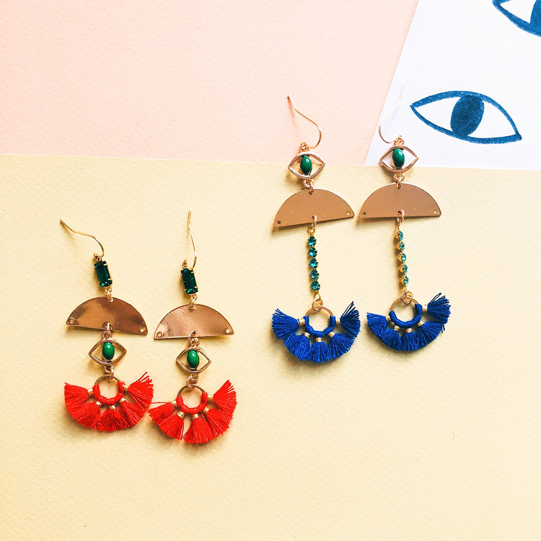 Gold plated hardware, alloy metal eye charms, glass stones.