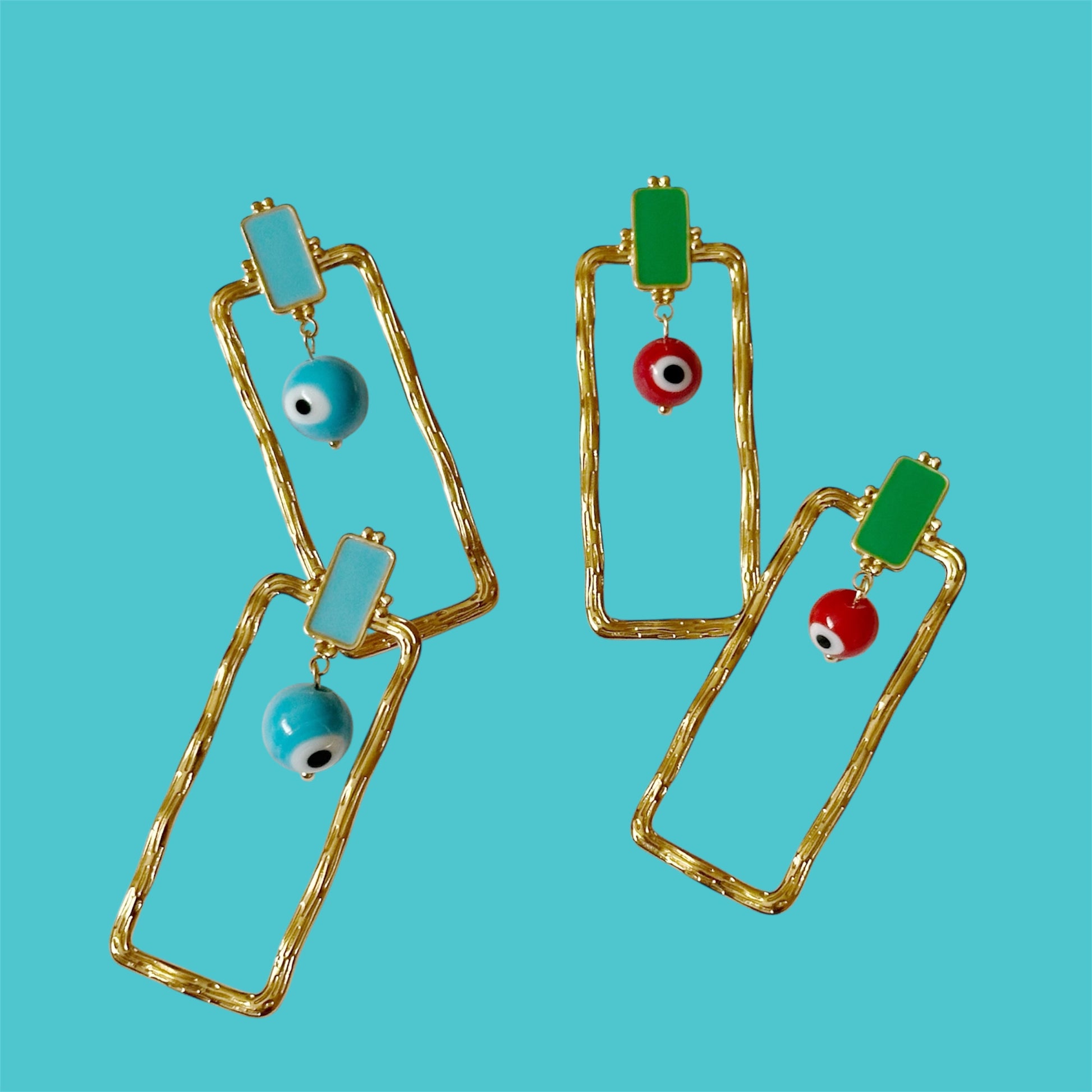 Gold plated stainless steel, glass eye beads, pair weighs 0.3oz.