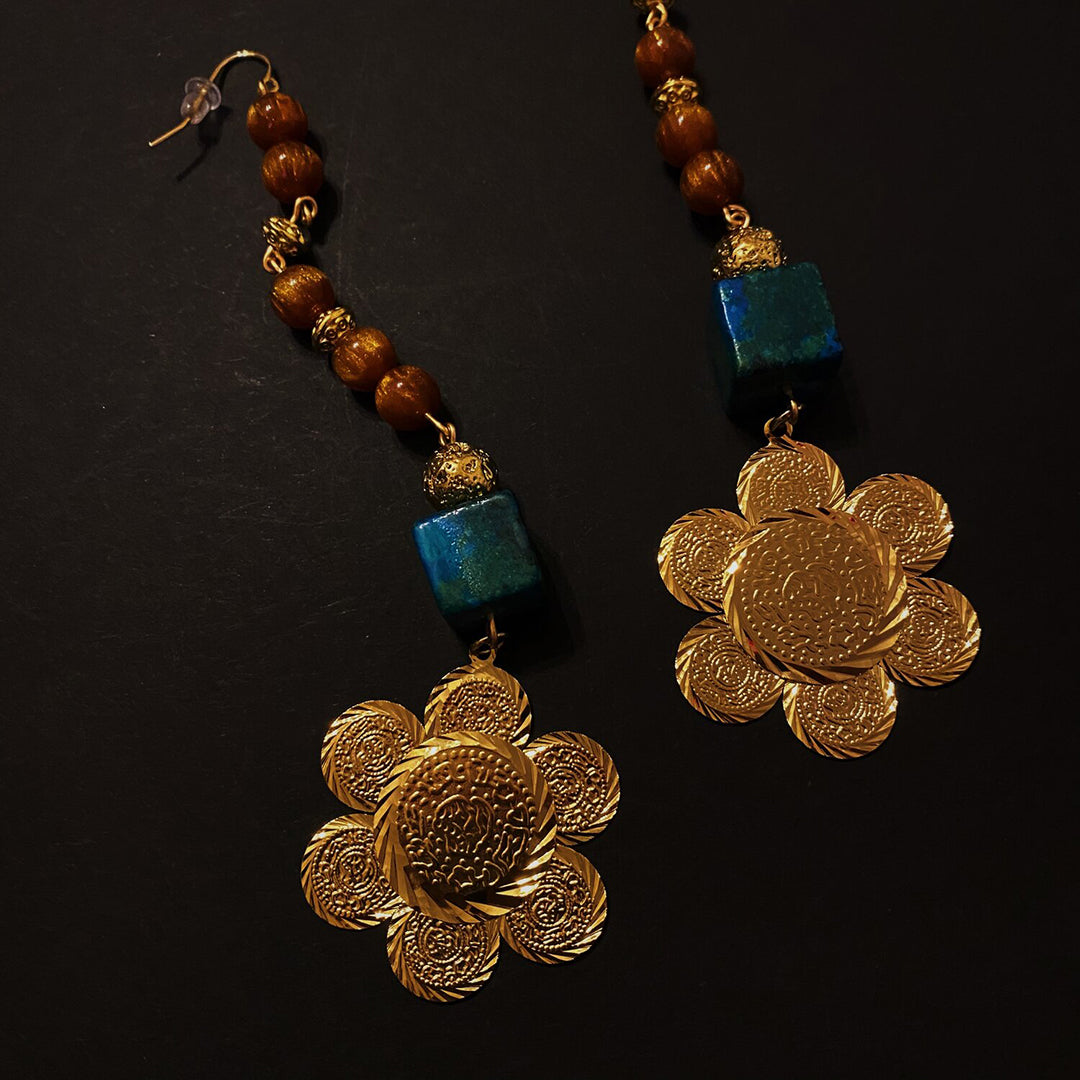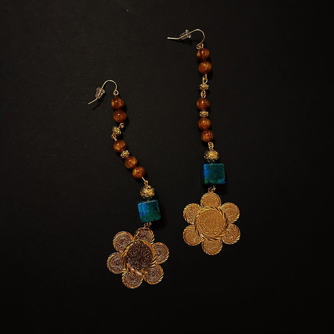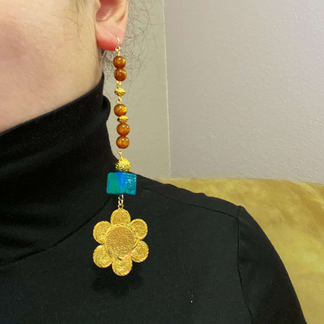 18k gold plated brass hardware, brown beads from a Kurdistan bazaar, metallic gold titanium coated lava beads, Chrysocolla square greenish/blue stone, gold plated stainless steel lira flower charm.
