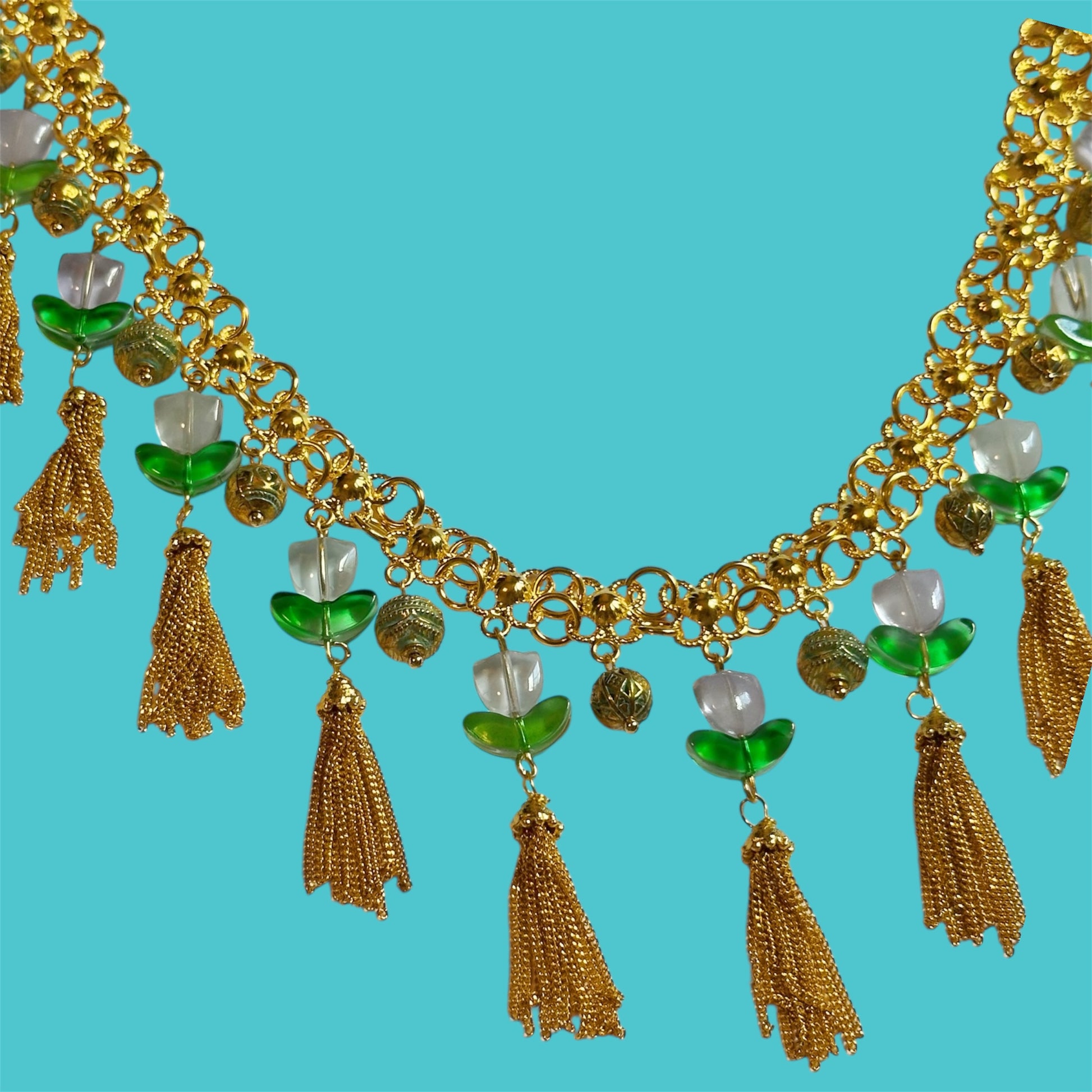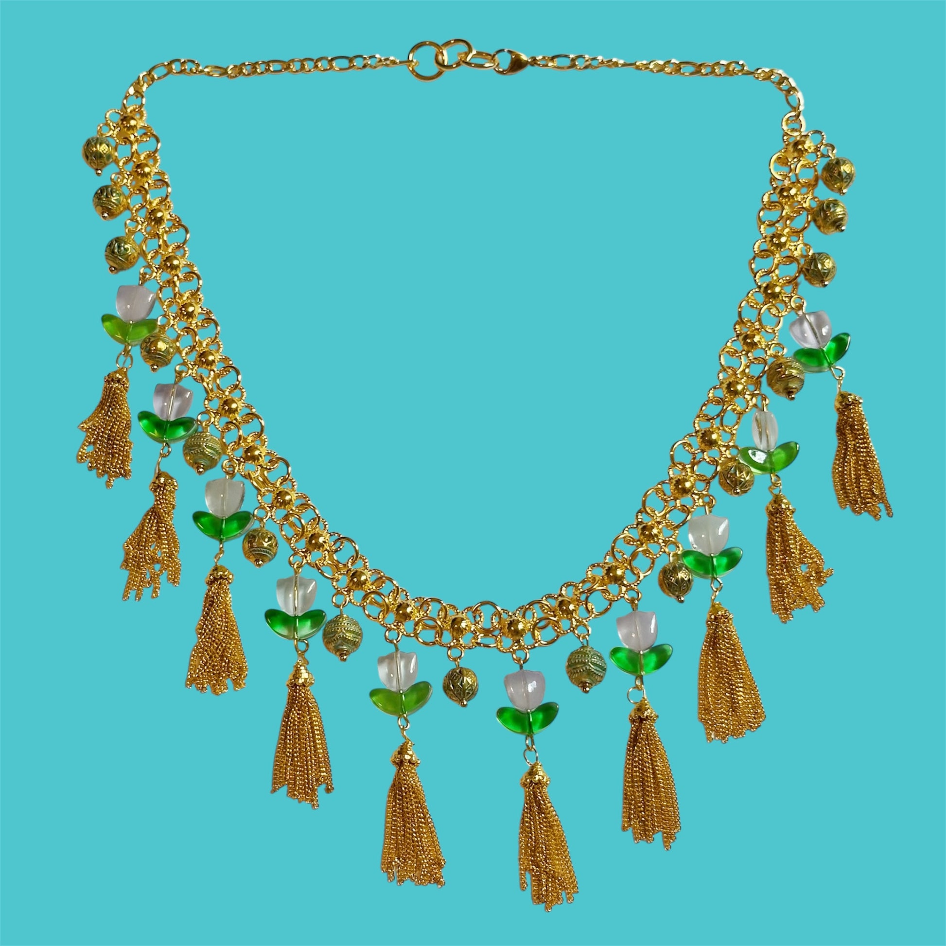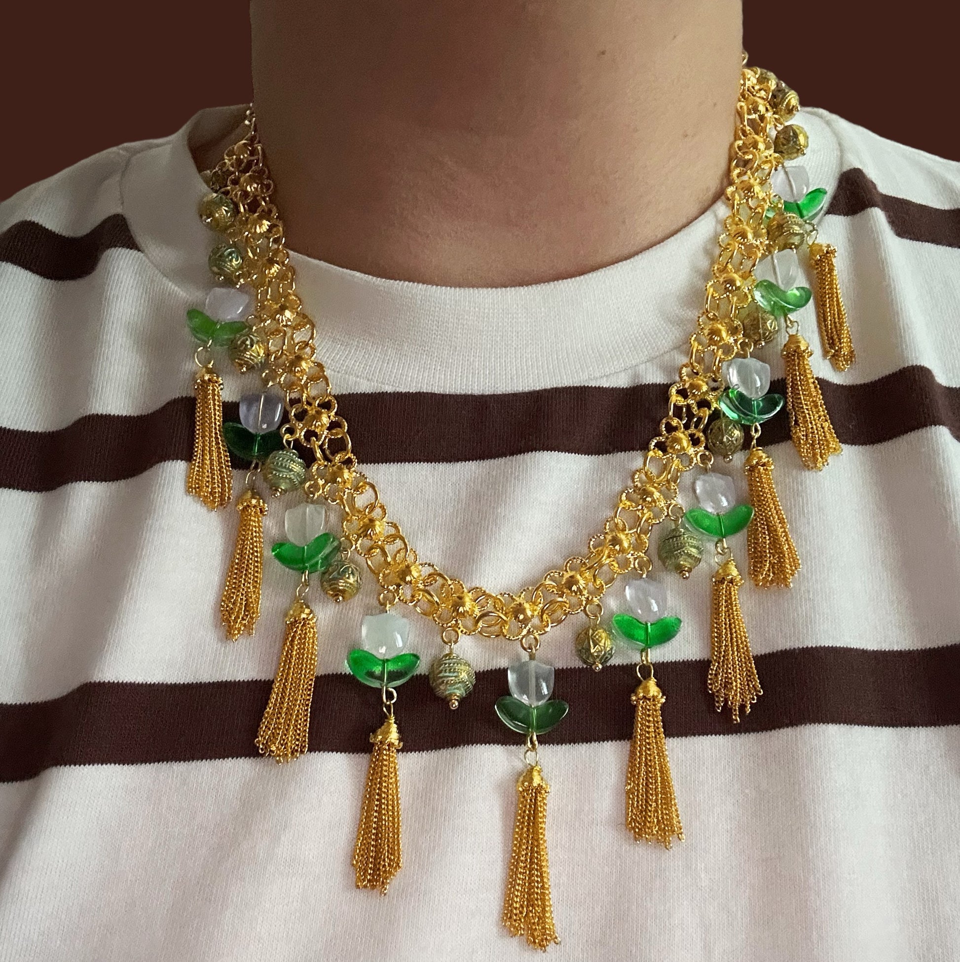 18.5" gold plated chain, tulip beads, patina gold beads, golden tassels, gold plated stainless steel hardware and findings.
