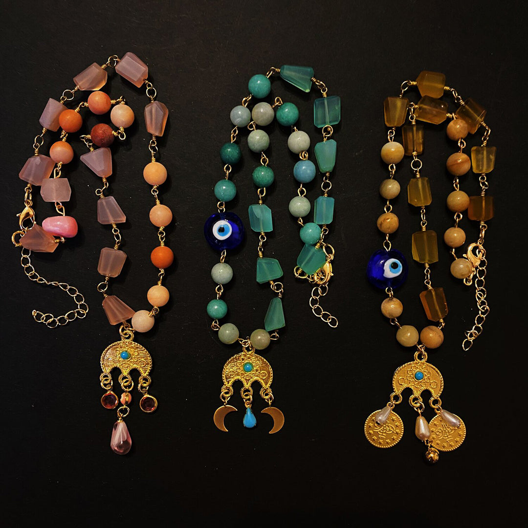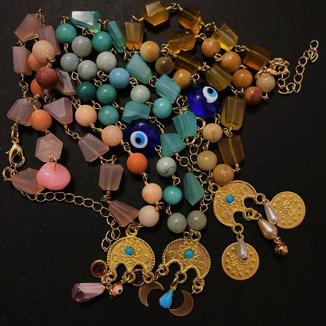 Turquoise/Green: Turquoise/green colored square stones with gold plated wire wrapping, dyed jade round beads, glass evil eye bead, Kurdish sarpacham charm with matte gold plated crescent moon charms and a vintage turquoise teardrop in a brass setting, 18k gold plated brass hardware/findings. 15inch chain with extension.