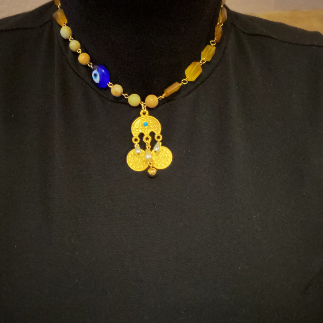 Yellowish Brown: gold plated wire wrapped square stones, dyed jade beads, glass evil eye bead, Kurdish sarpacham charm with gold lira coins, vintage oval teardrop pearl beads, 18k gold plated brass hardware/findings, 14inch chain with extension.